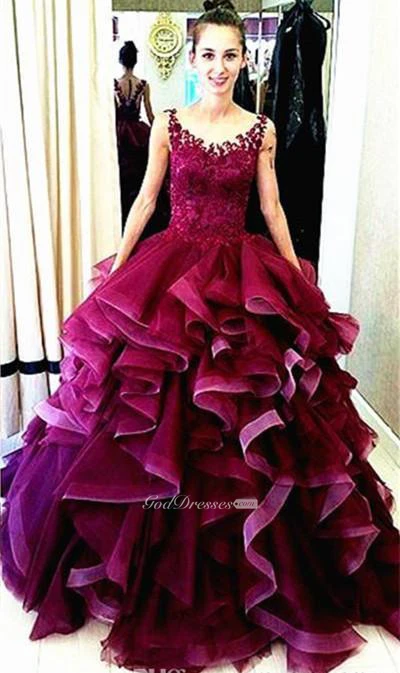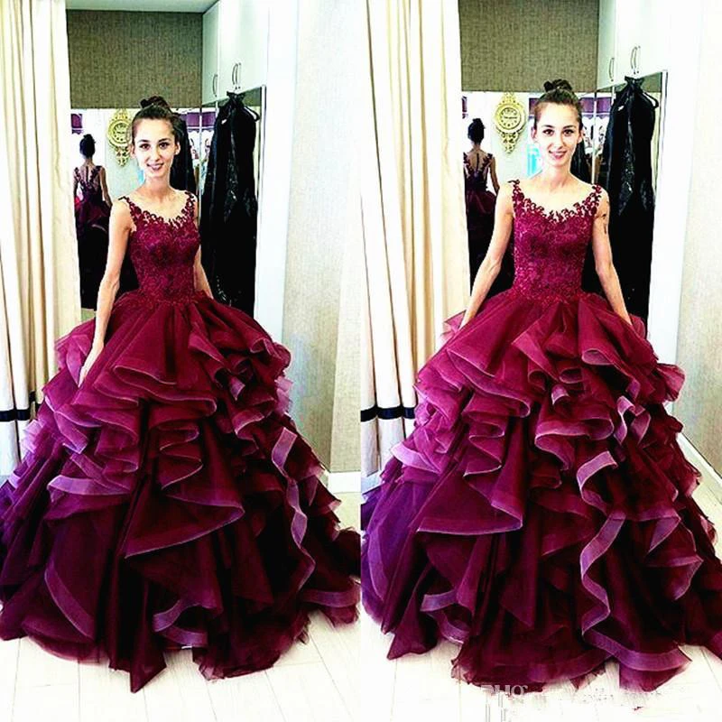Newest Lace Appliques Ruffles Princess Evening Dress Sleeveless