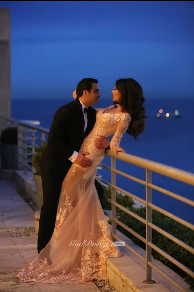 Newest Long Sleeve Lace Appliques Evening Dress Mermaid Sweep Train