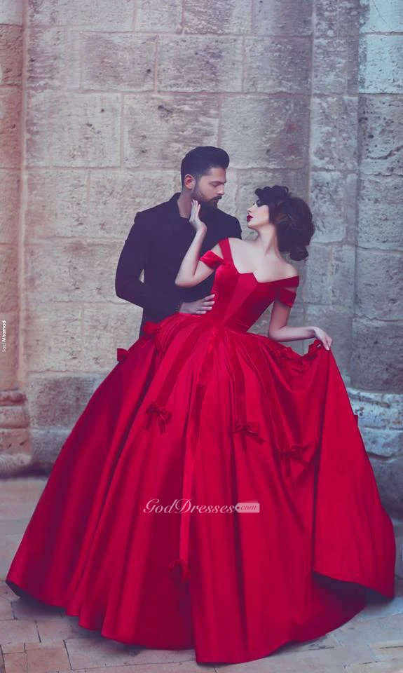 Newest Red Bowknot Ball Gown Evening Dress Off-the-shoulder Floor-length