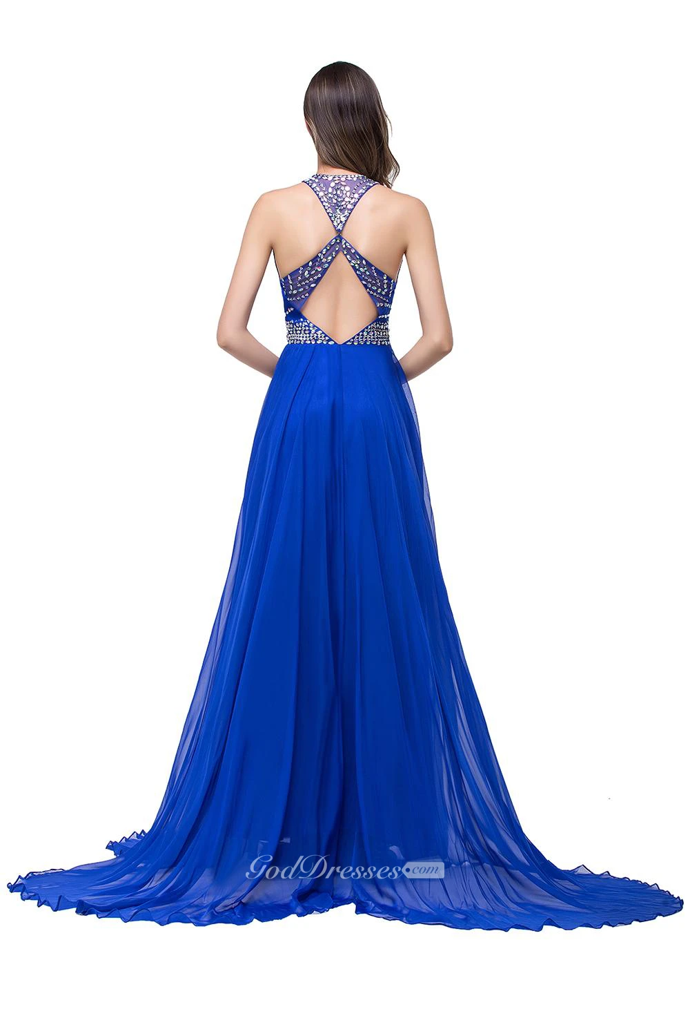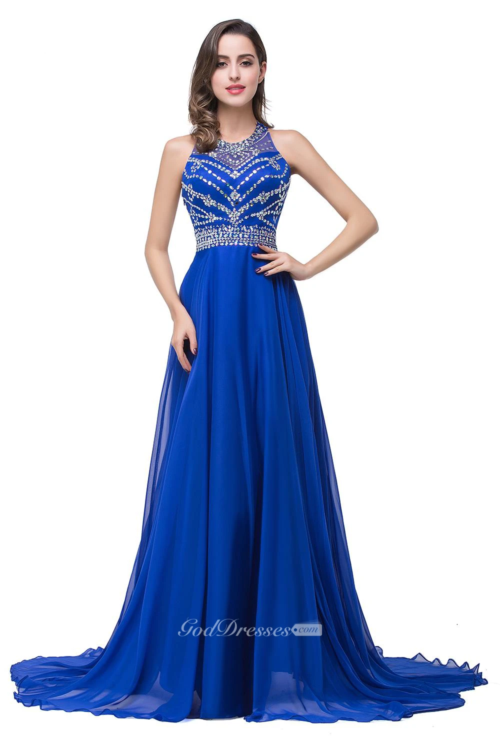 Newest Royal Blue Chiffon Prom Dress A-line Beadings Sweep Train