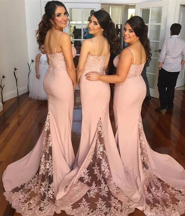 Newest Spaghetti Strap Mermaid Lace Bridesmaid Dress Sweep Train