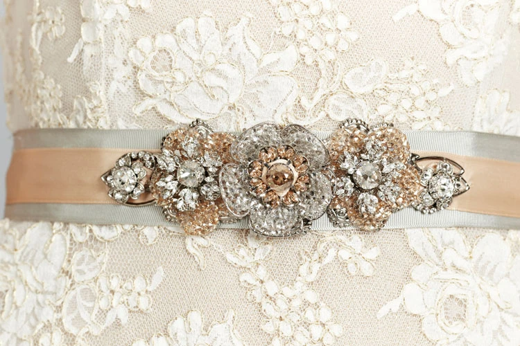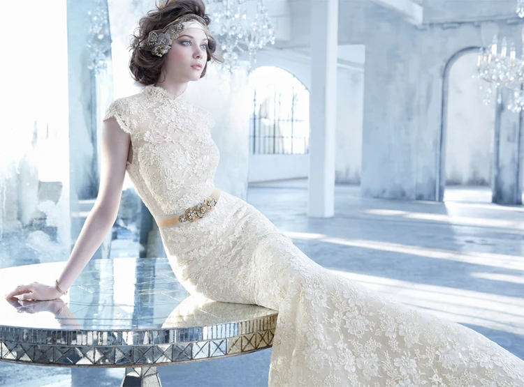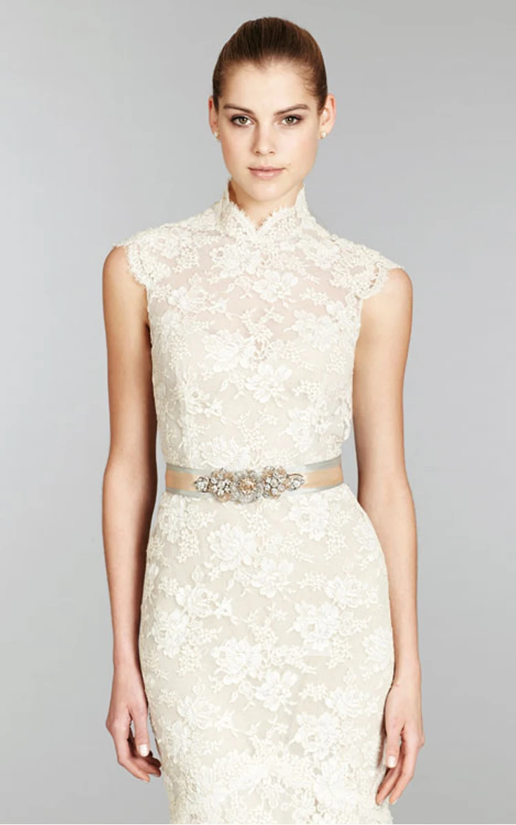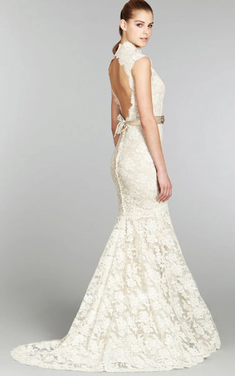 Noble Cap Sleeve Lace Mermaid Gown With Crystal Belt and Keyhole Back
