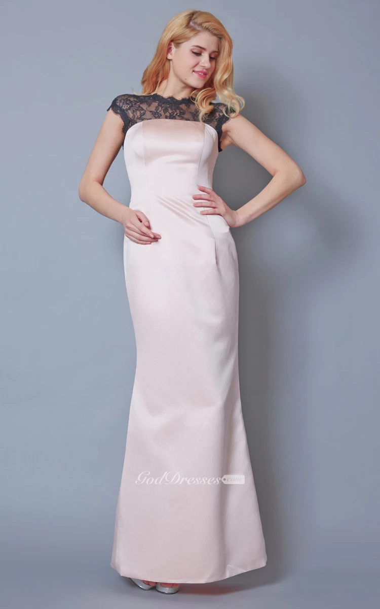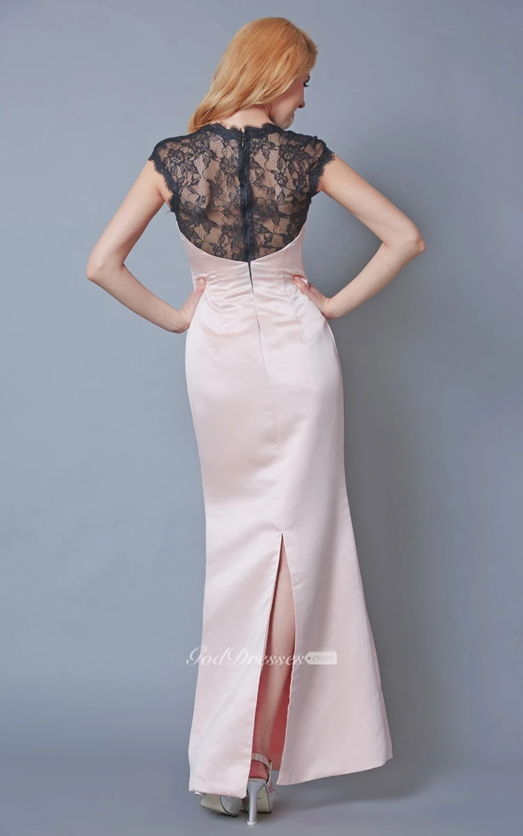 Noble Lace Cap-sleeved Sheath Satin Gown With Back Split