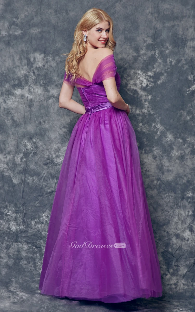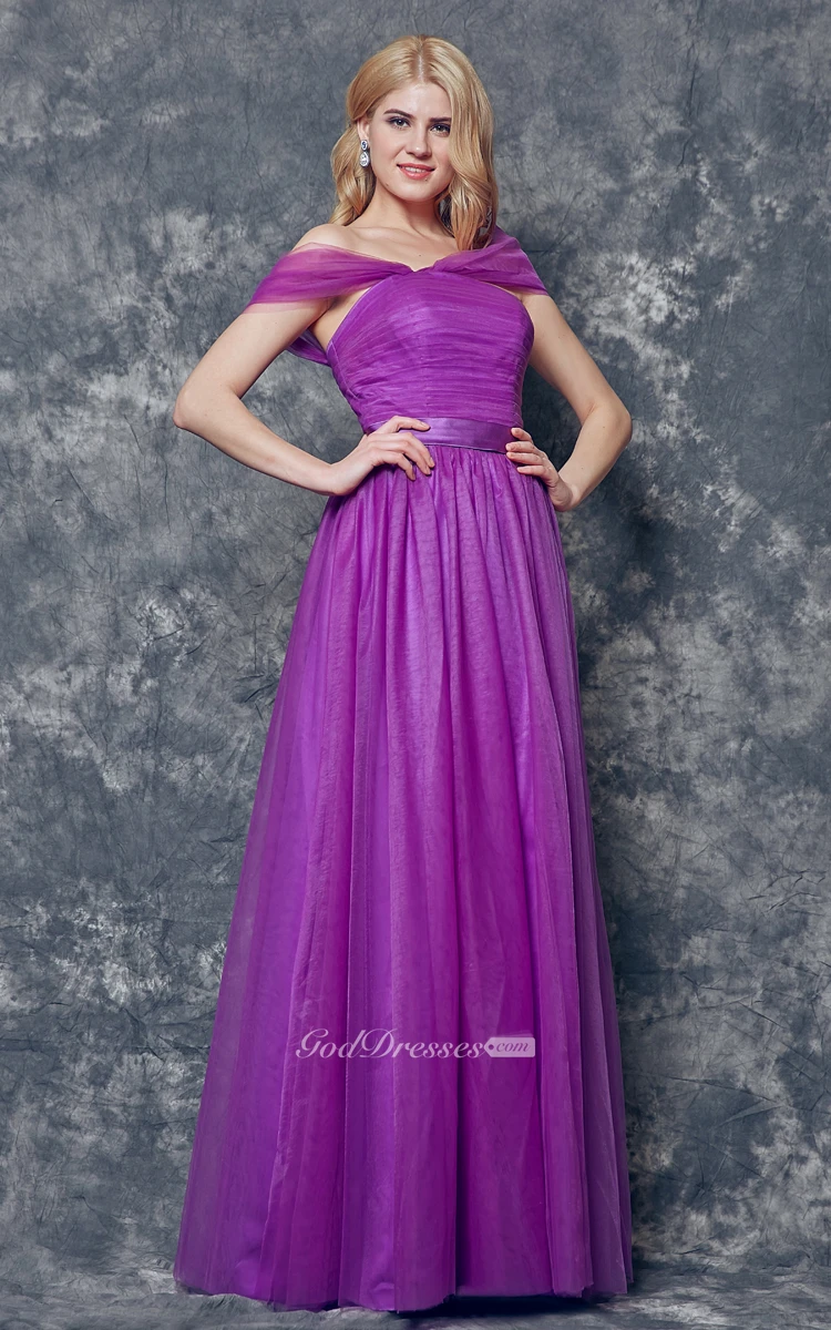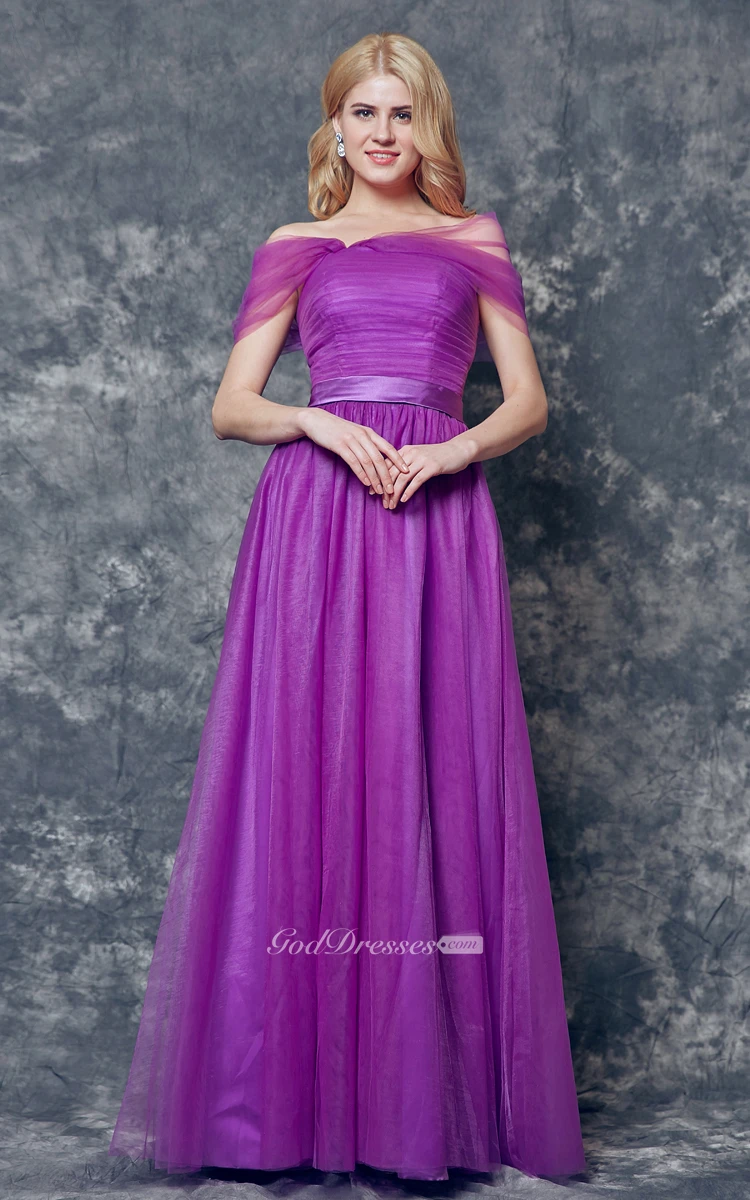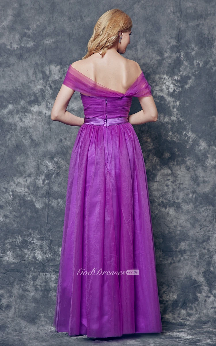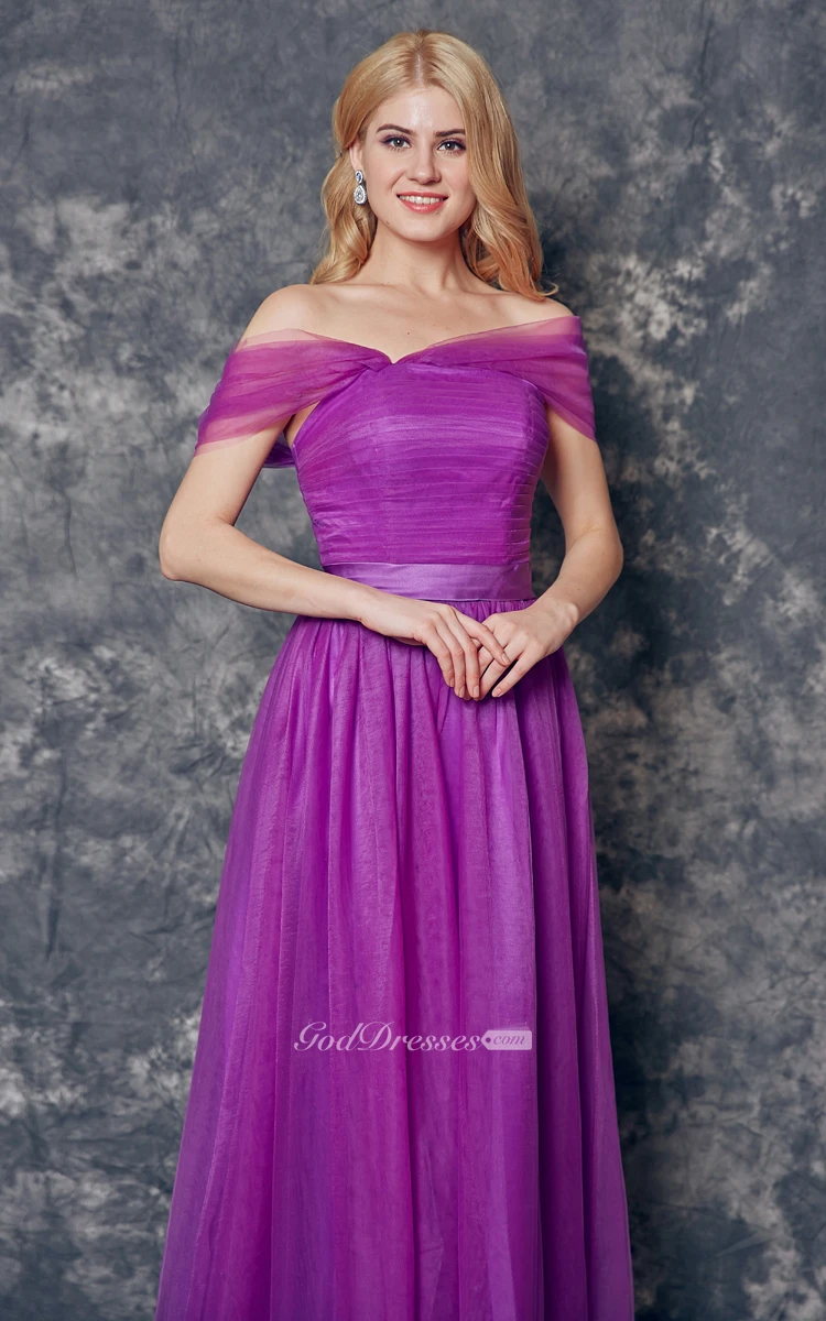 Noble Off-the-shoulder Long A-line Tulle Dress With Pleats