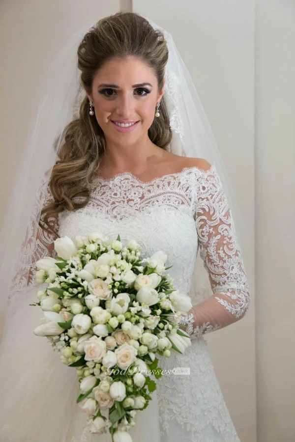 Noiva Train Ivory Long Sleeve Lace Wedding Dress Elegant Sweep Zipper Back Vestidos De Applique Wedding Dress