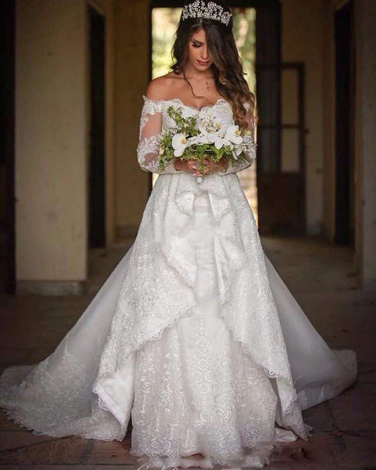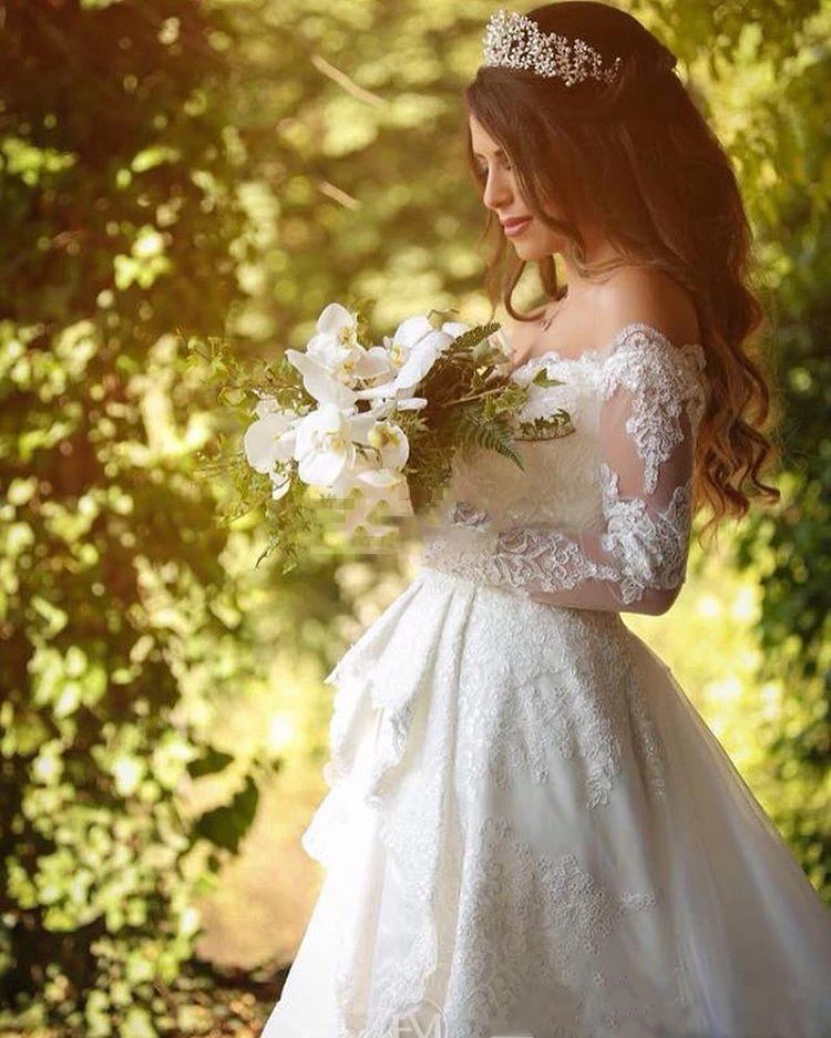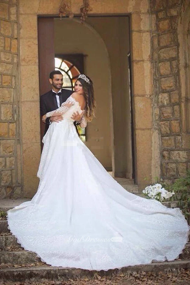 Off Shoulder Long Sleeves Backless Lace Wedding Bridal Gown