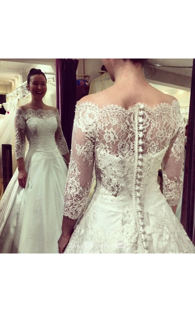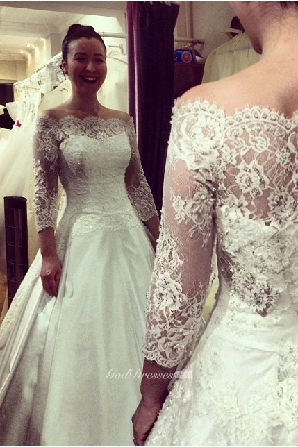 Off-shoulder Scalloped Neckline Satin Ball Gown With Lace and 3-4 Sleeves