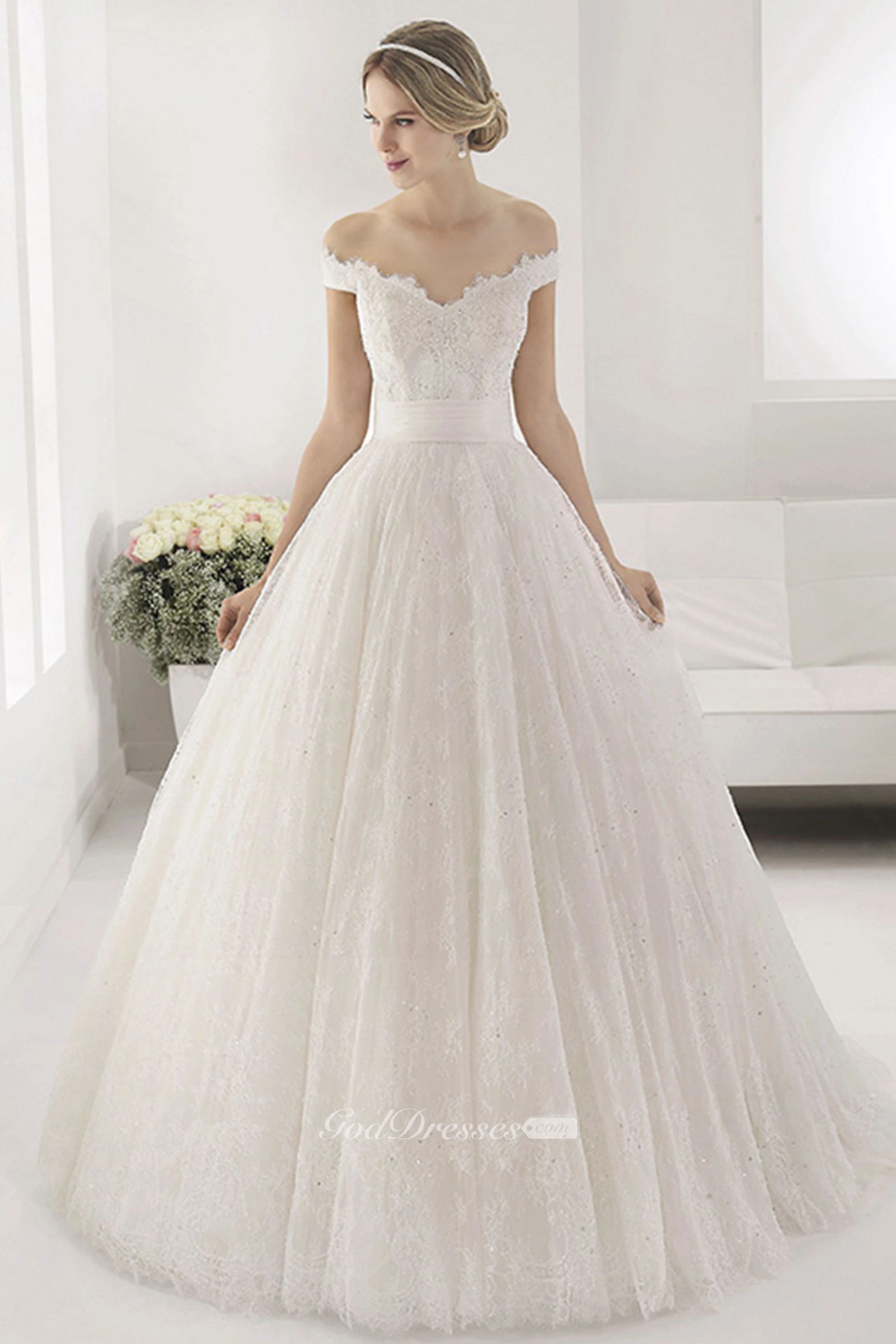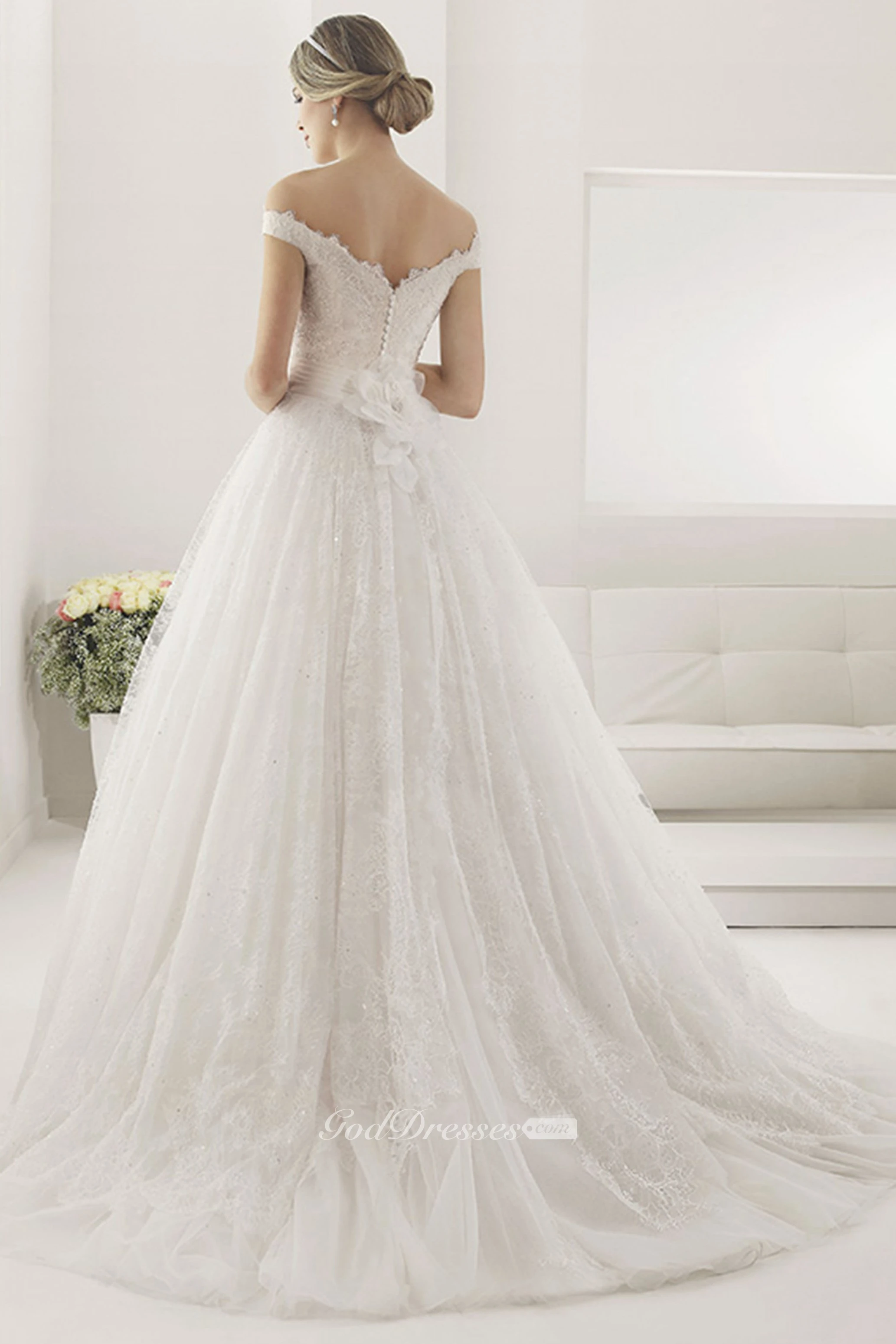 Off Shoulder Sequined Lace Ball Gown With Bandage Back Flower