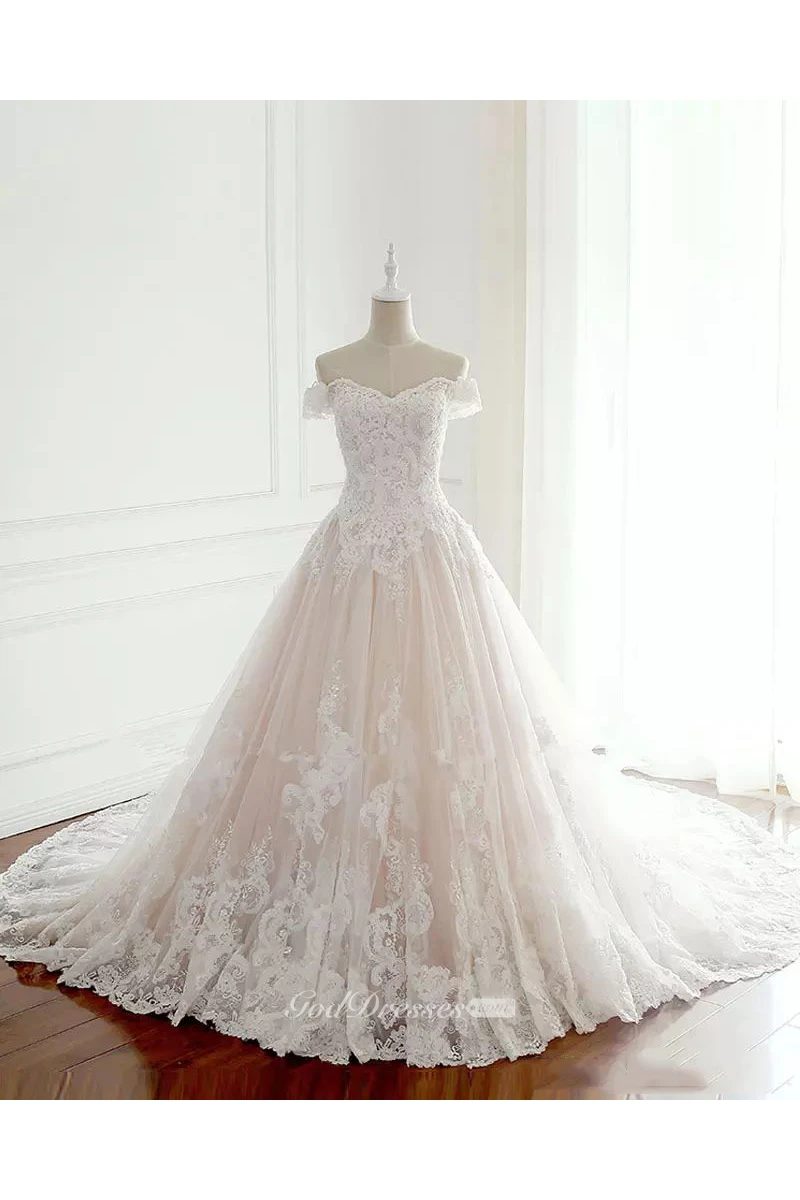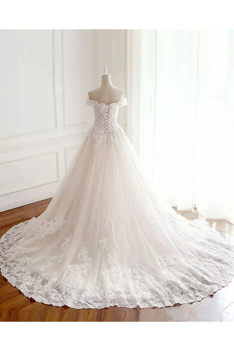 Off-the-shoulder A-line Floor-length Chapel Train Sleeveless Lace Tulle Wedding Dress with Lace-up Back