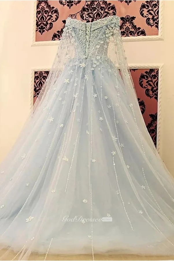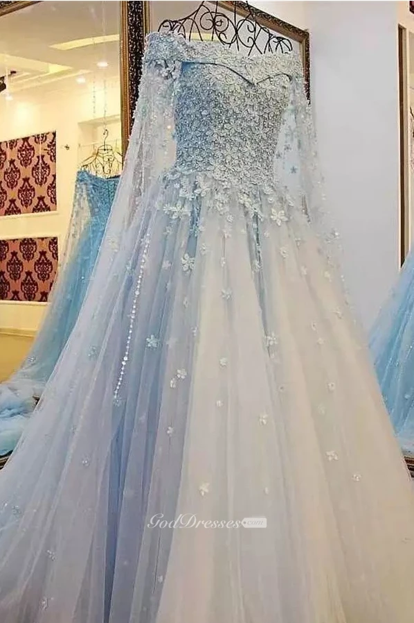 Off-the-shoulder Cap Short Sleeve Court Train Lace Tulle A-Line Wedding Dress