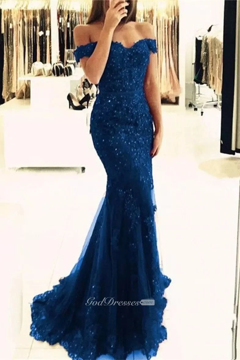 Off-the-shoulder Cap Short Sleeve Sweep/Brush Train Lace Tulle Trumpet Dress