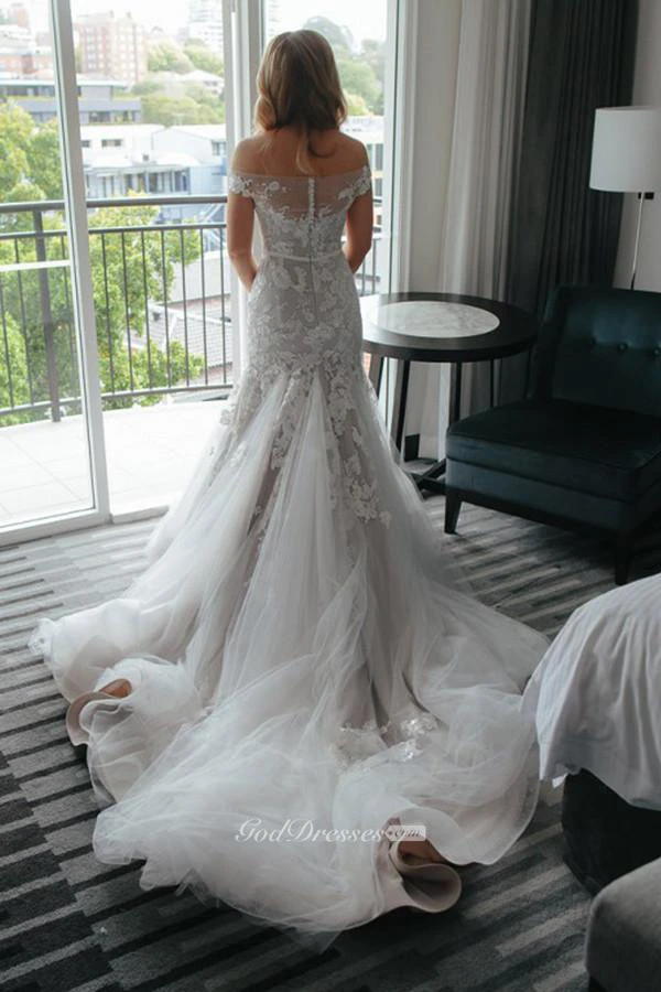 Off-the-shoulder Court Train Lace Tulle Wedding Dress with Appliques