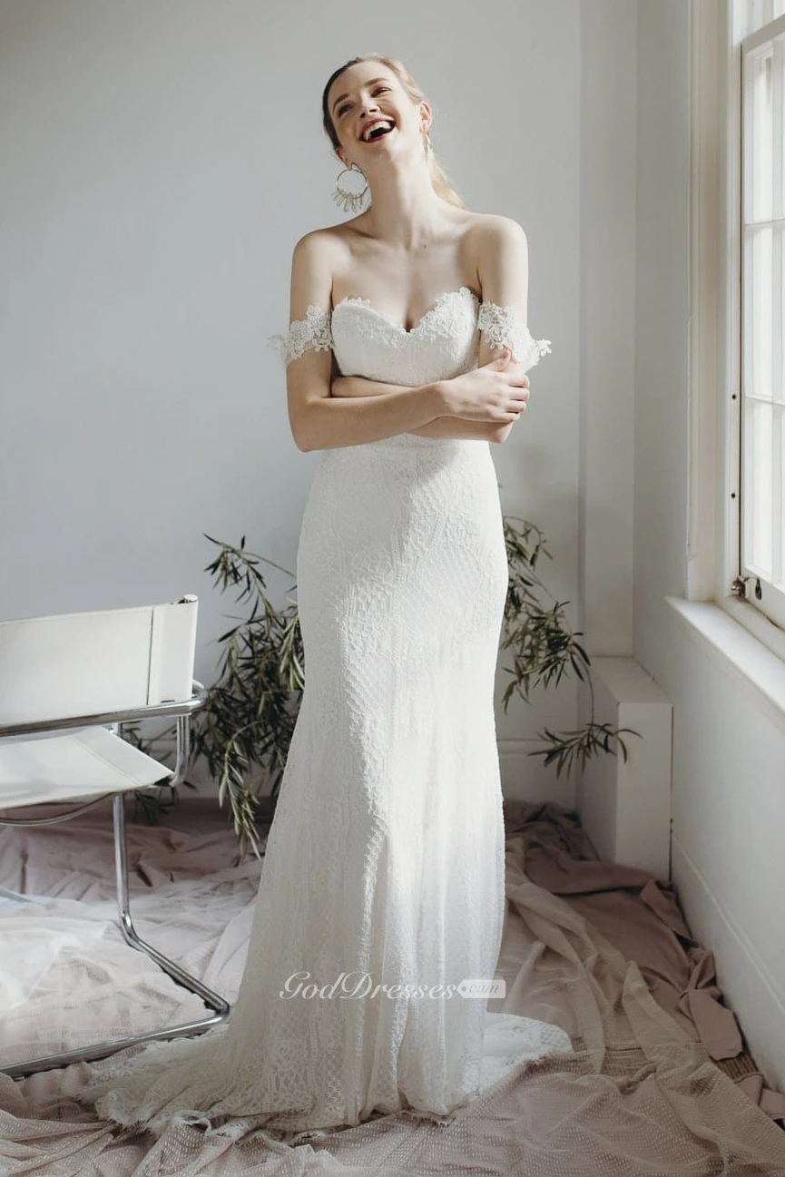 Off-the-shoulder Elegant Sheath Sweetheart Lace Open Back Wedding Dress With Buttons