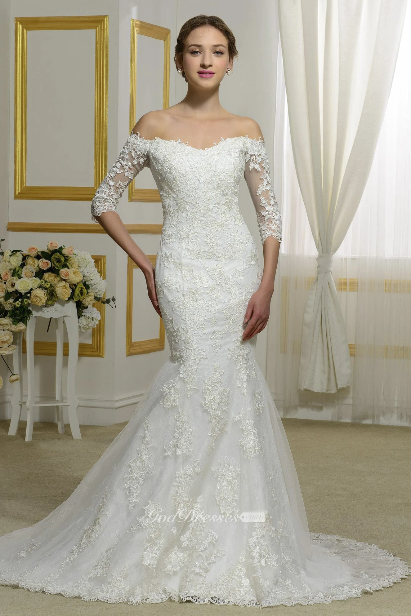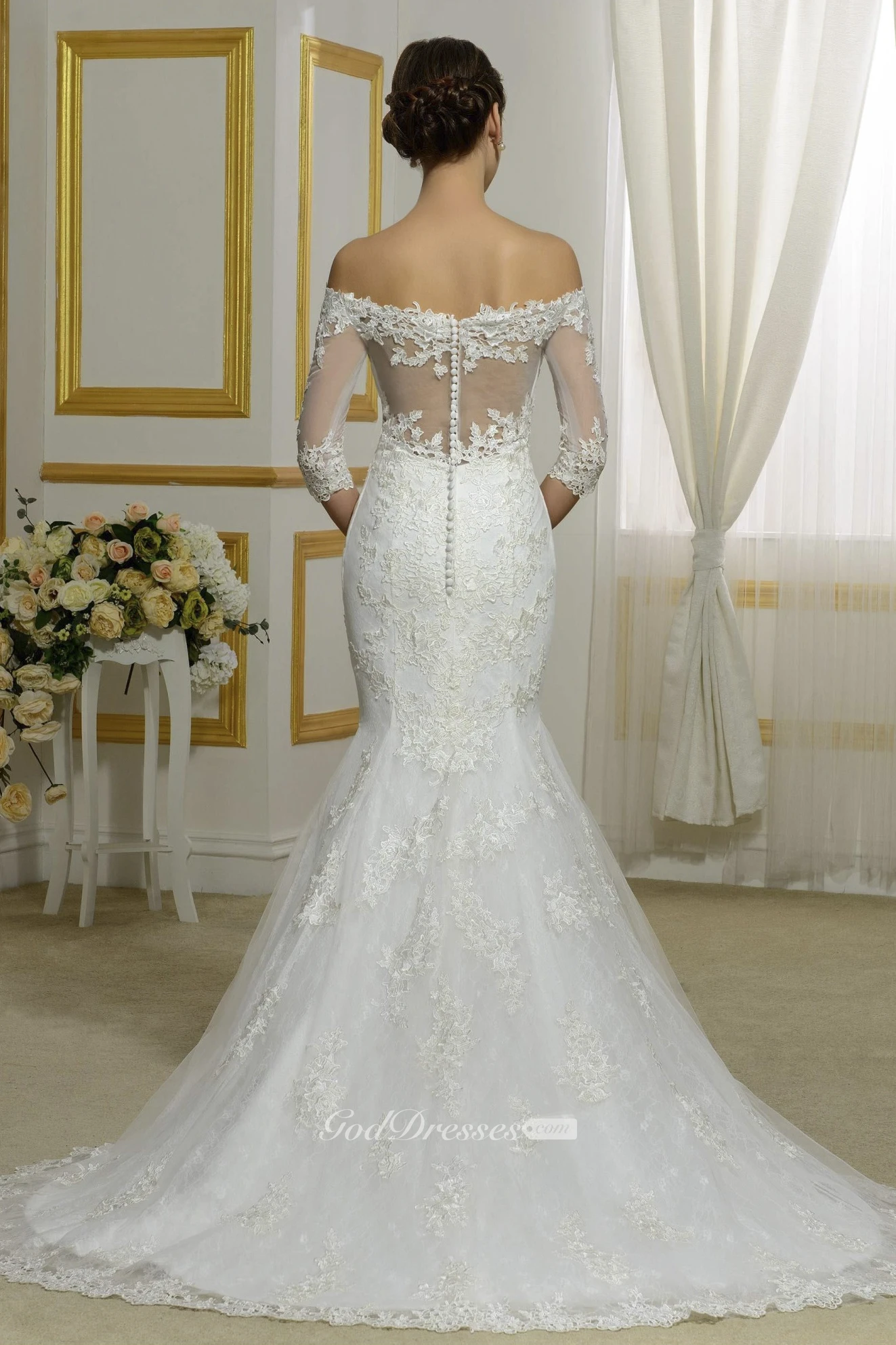 Off-the-shoulder Lace Elegant 3/4 Sleeve Mermaid Wedding Dress With Illusion Button Back