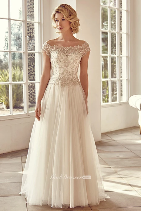 Off-The-Shoulder Maxi Short-Sleeve Beaded Tulle Wedding Dress