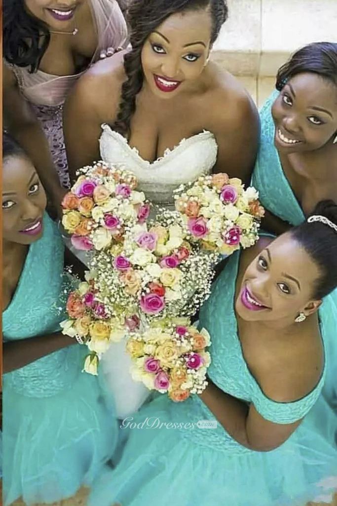 Off-the-shoulder Mermaid Floor-length Sleeveless Lace Tulle Bridesmaid Dress with Zipper Back