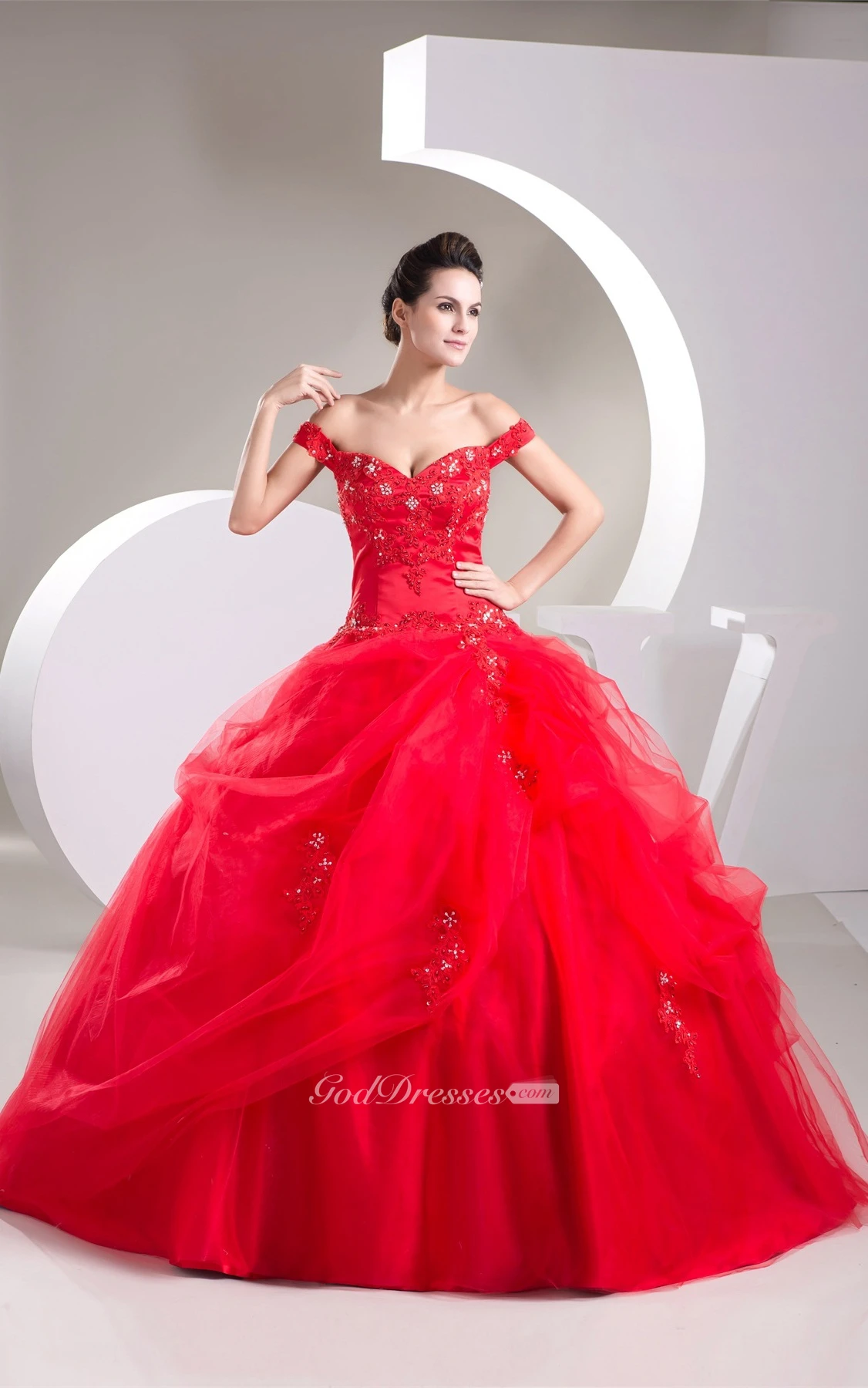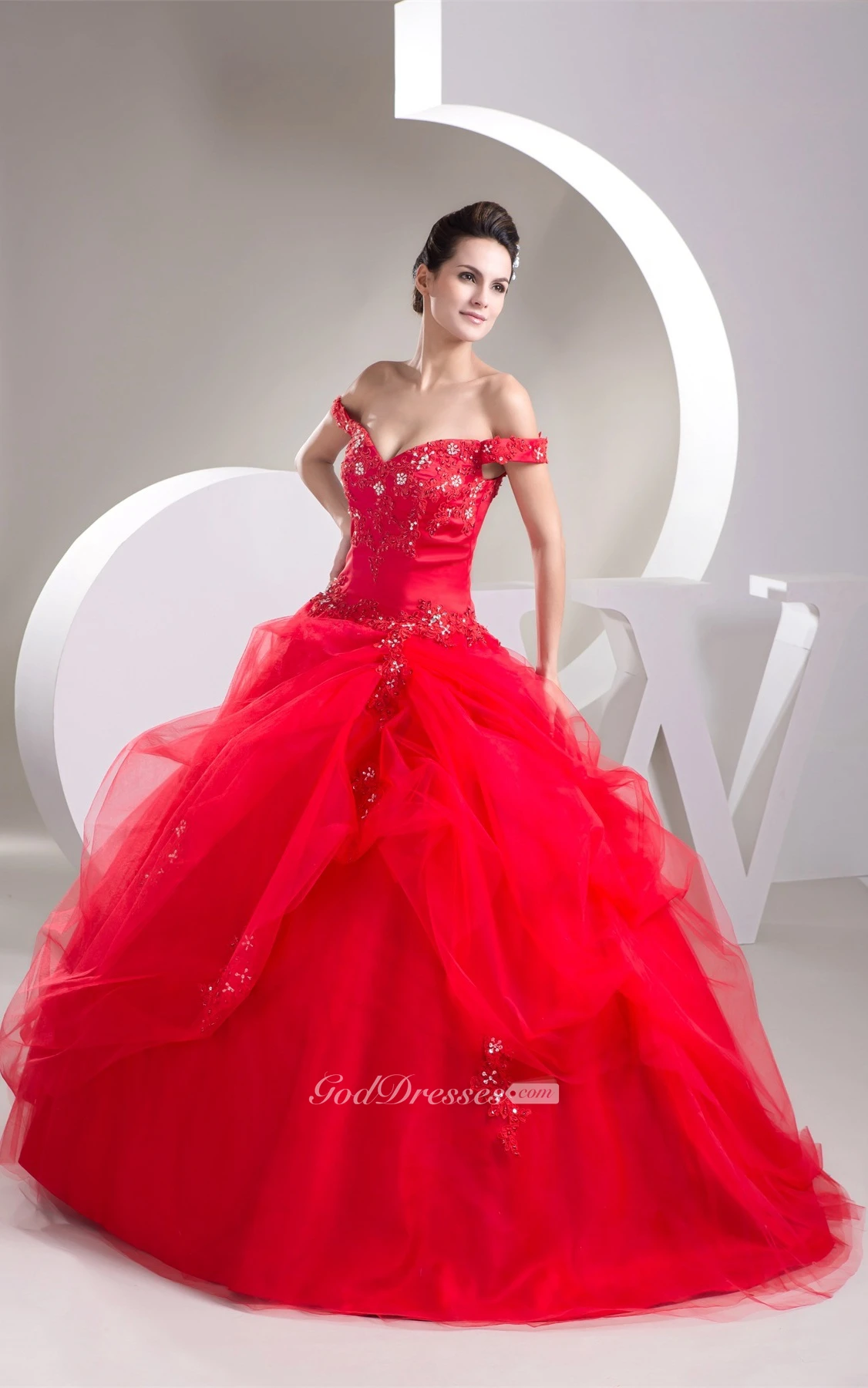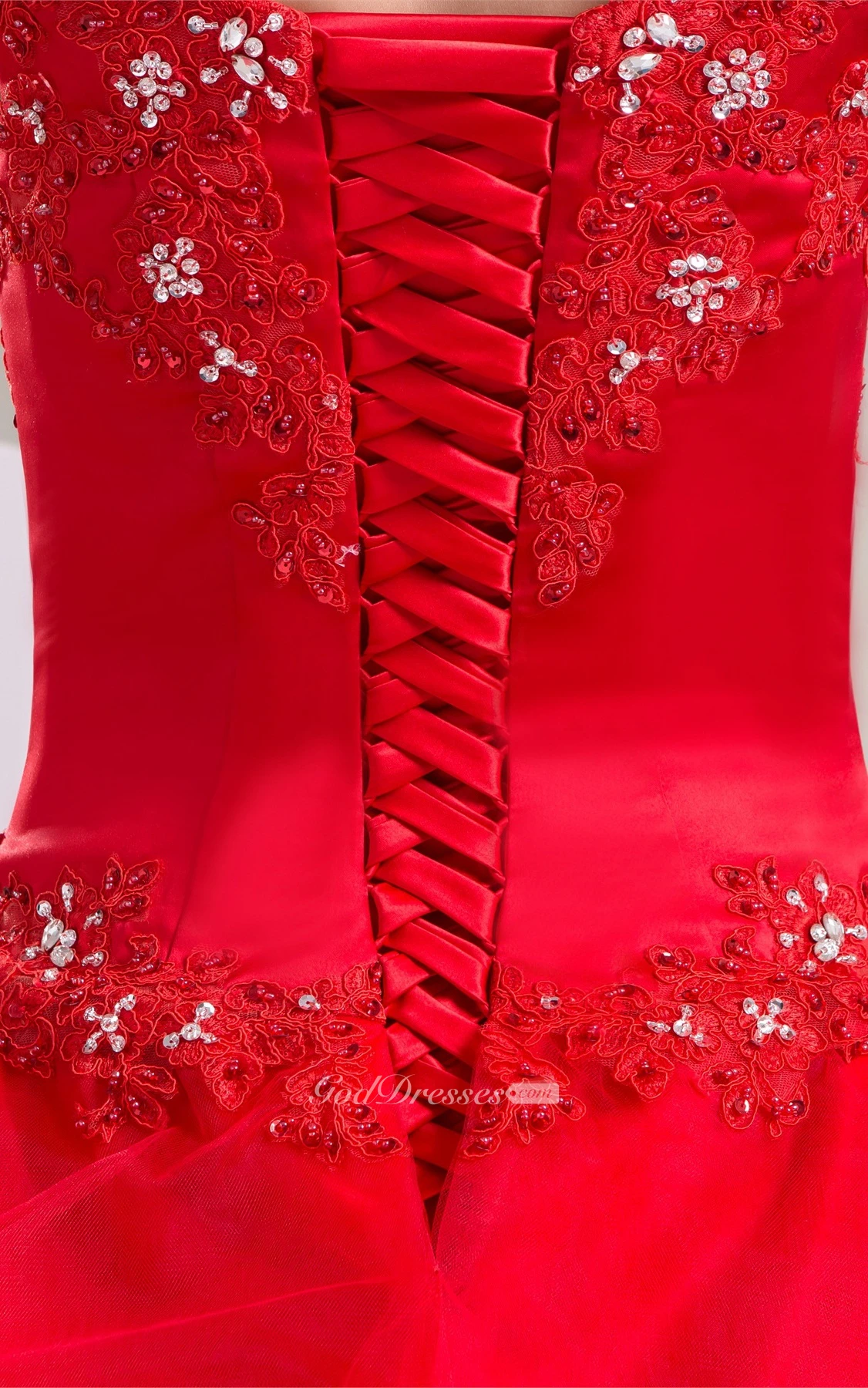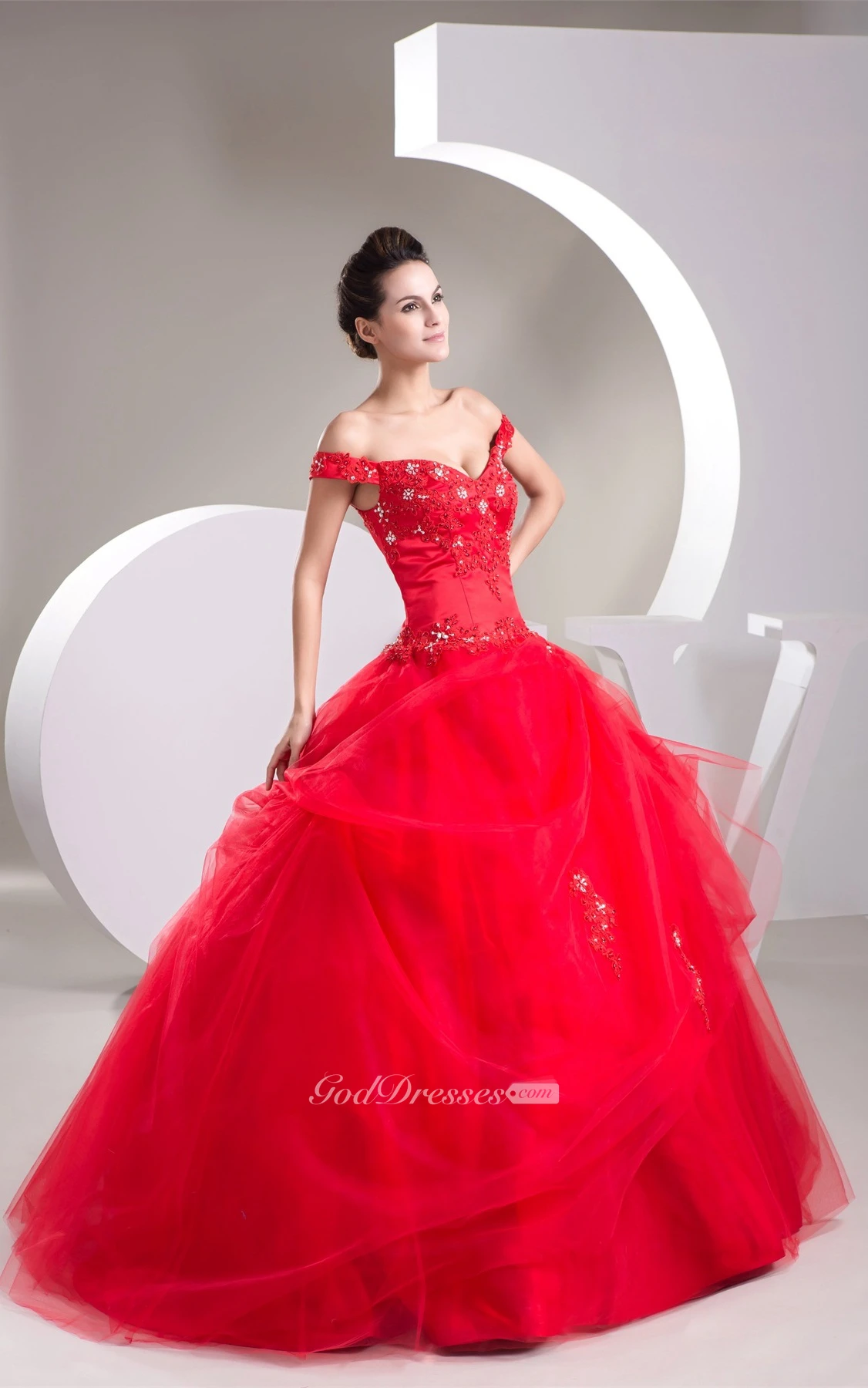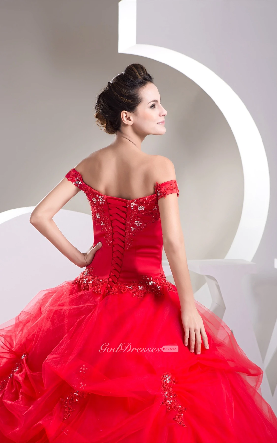 Off-The-Shoulder Ruffled Corset Back and Ball-Gown With Appliques