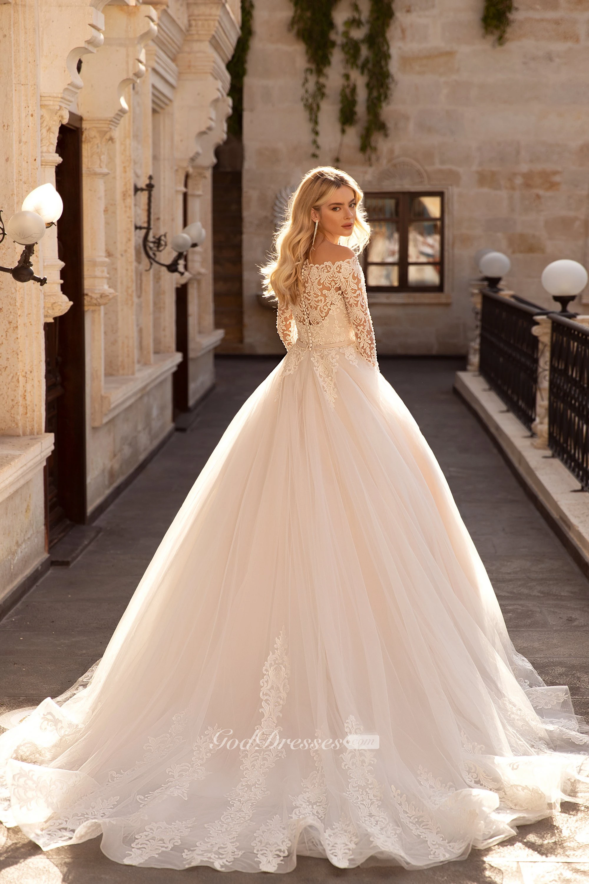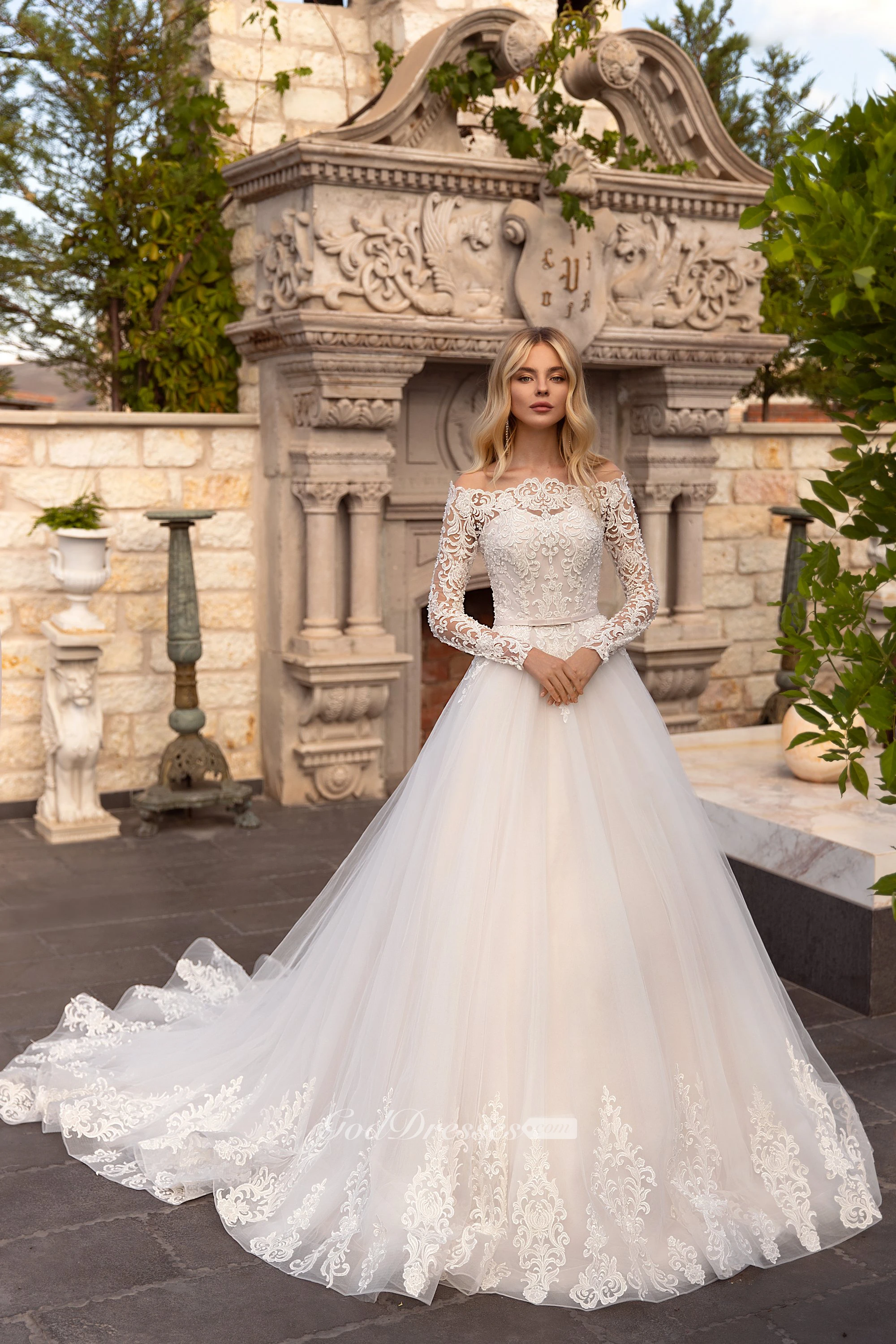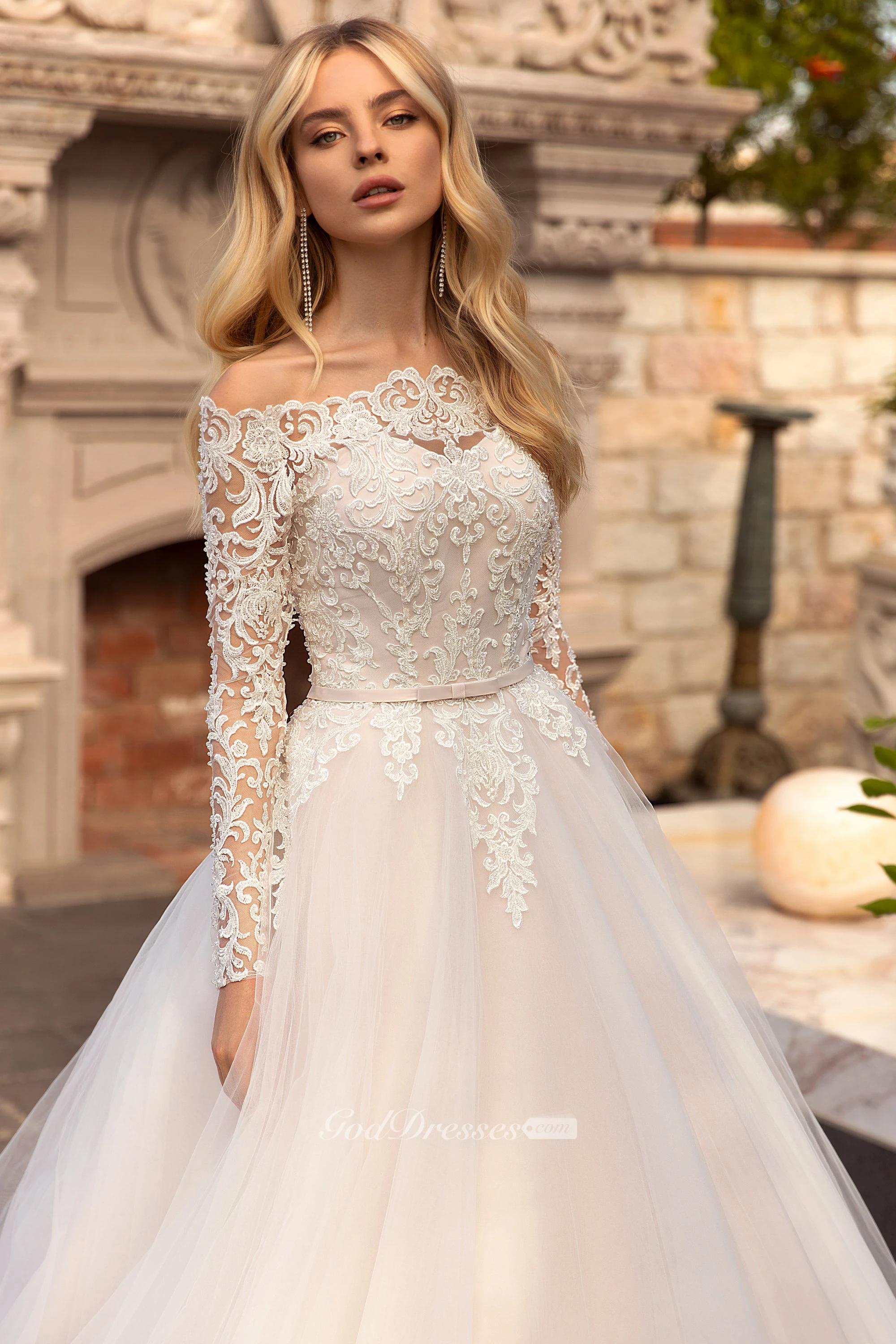 Off-the-shoulder Sash Illusion Long Sleeve And Button Back Ballgown Lace Tulle Wedding Dress