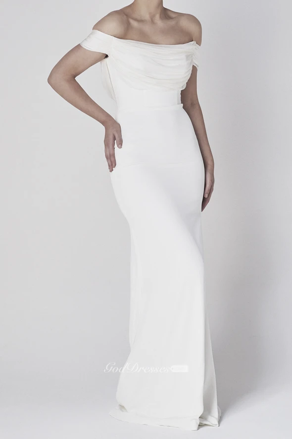 Off-the-shoulder Sheath Elegant Satin Wedding Gown With Tiers And V-back