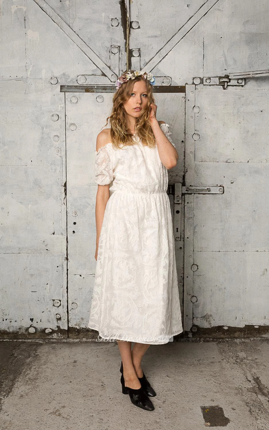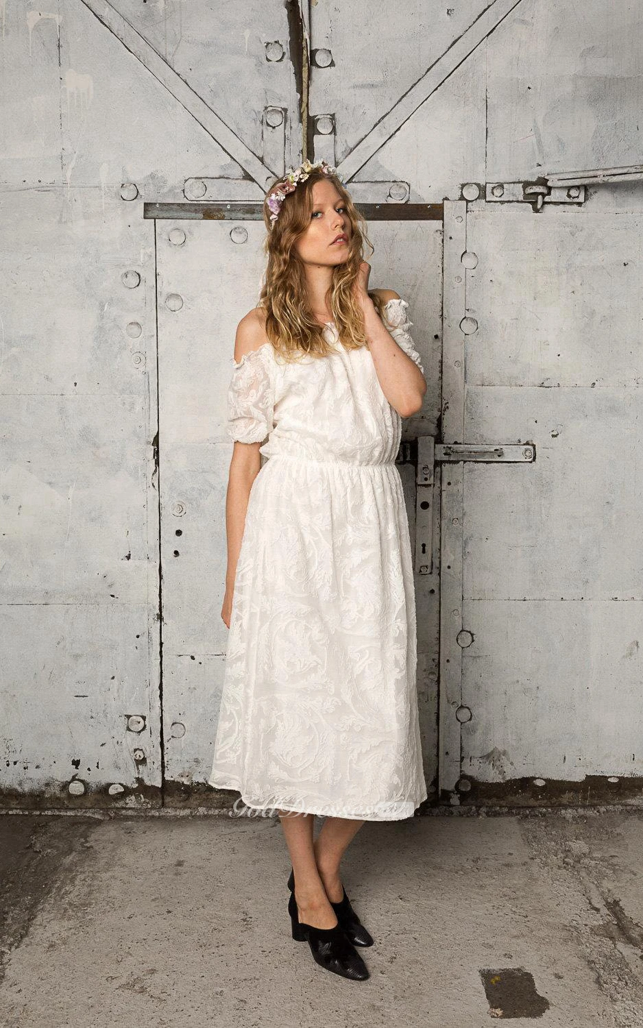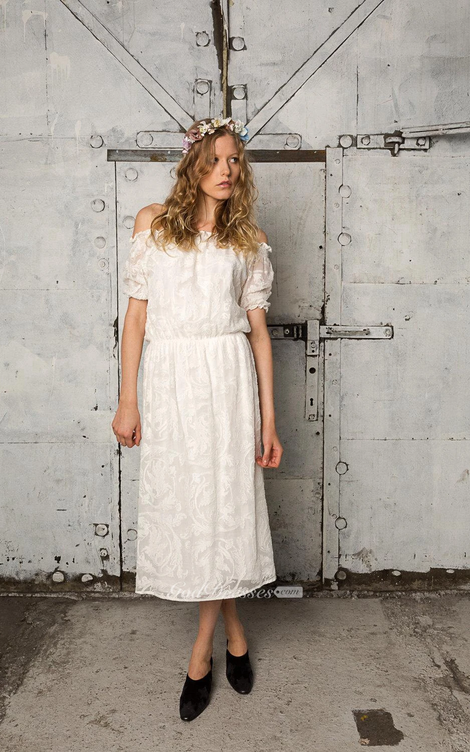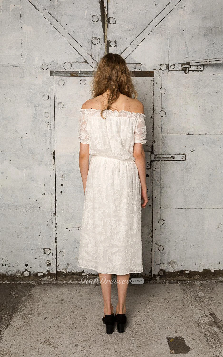 Off-The-Shoulder Short Sleeve A-Line Lace Tea Length Dress