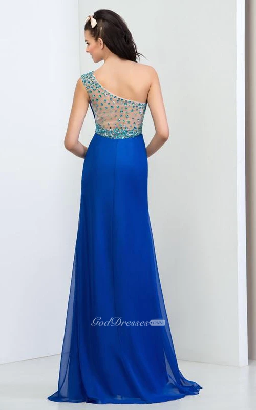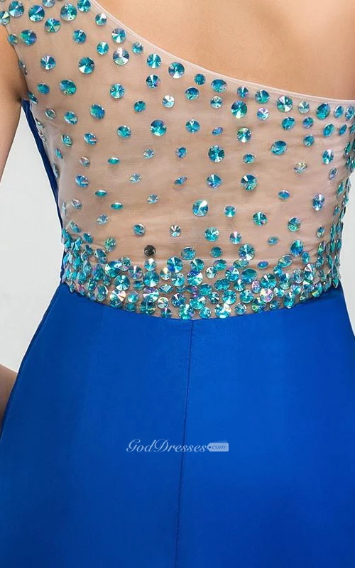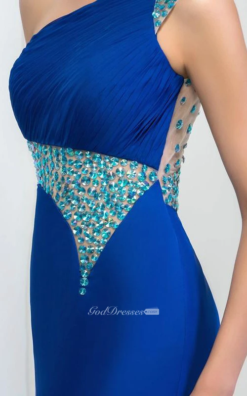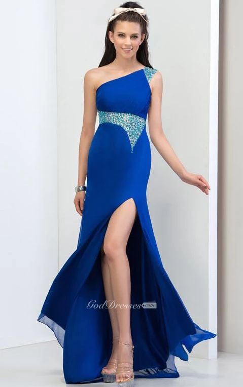 One Shouder Pleats Beaded Side Split Prom Dress