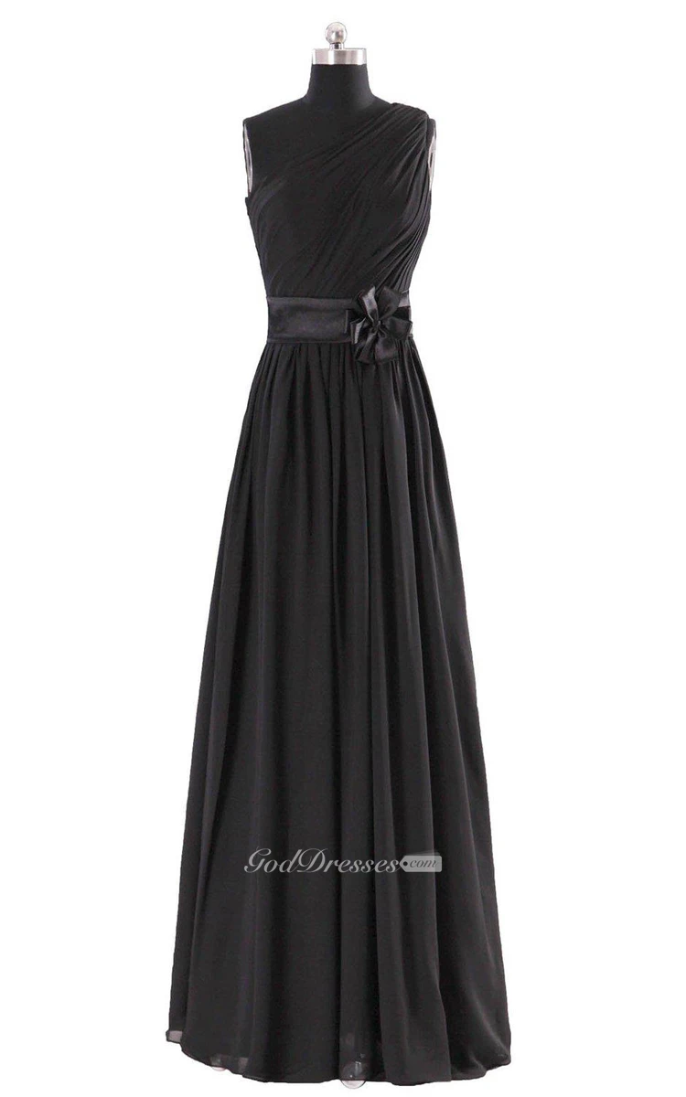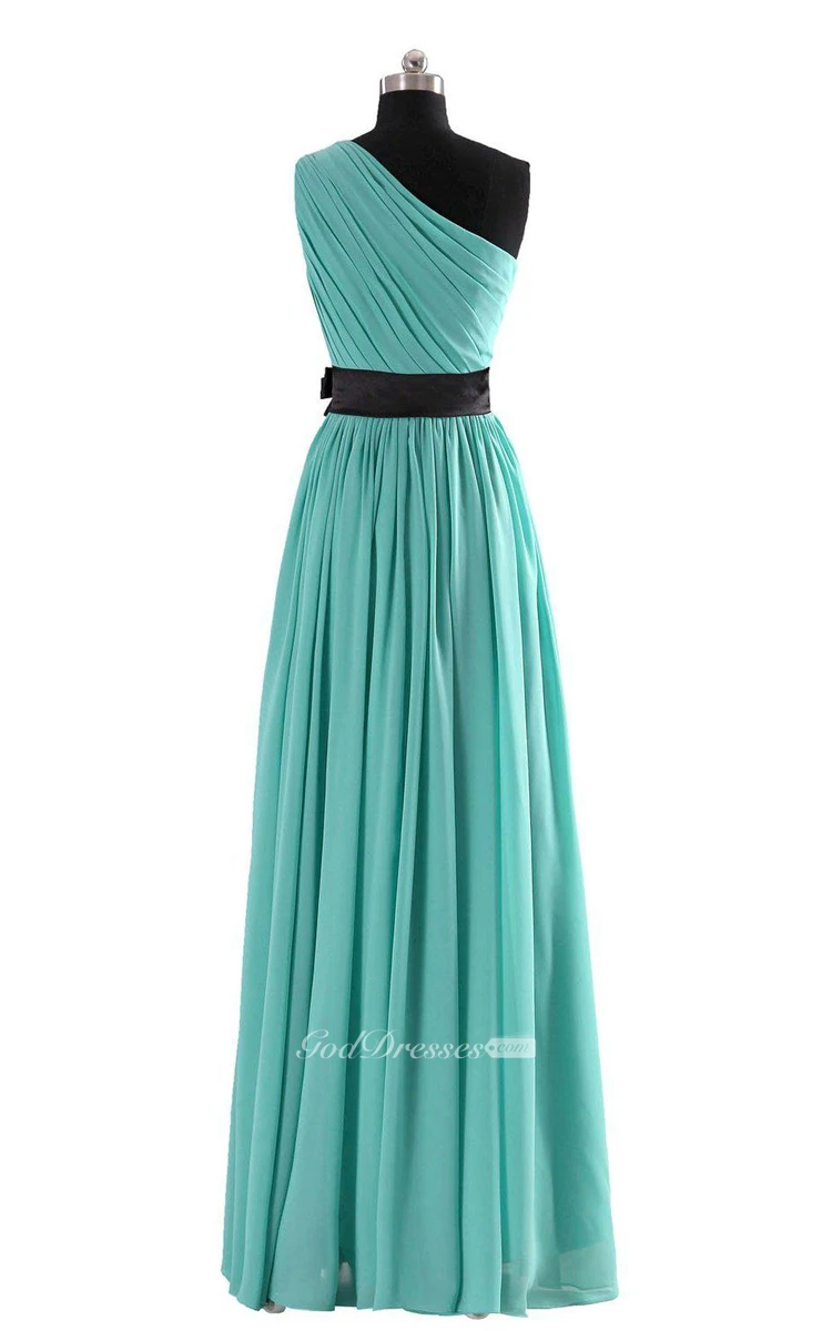 One-shoulder A-line Pleated Chiffon Gown With Belt