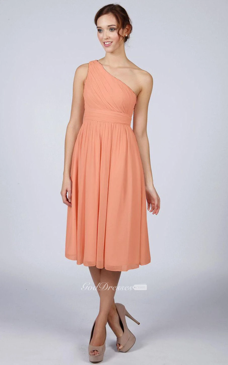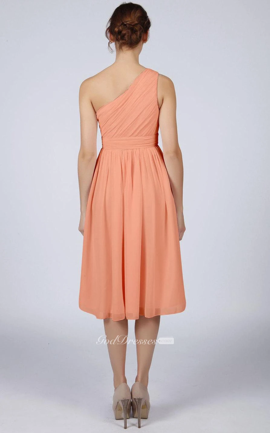 One Shoulder A-line Pleated Chiffon Knee Length Dress Orange