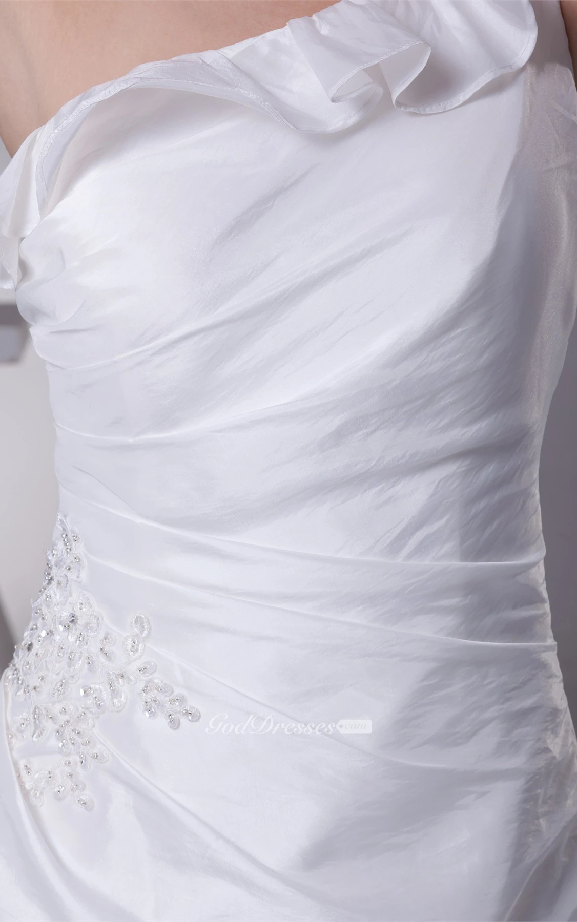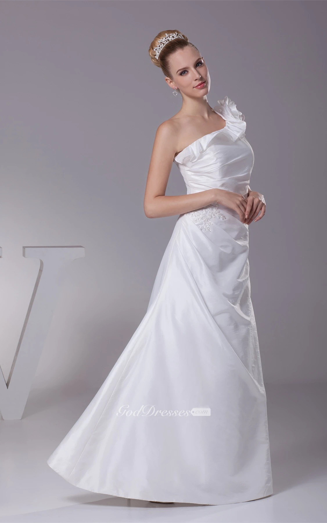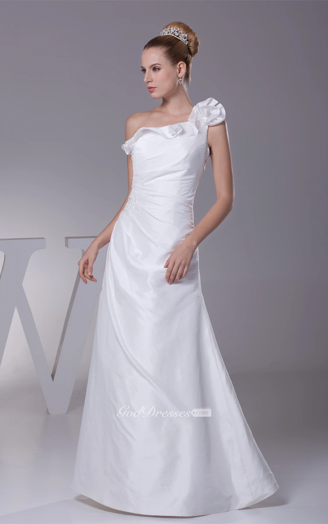 One-Shoulder A-Line Ruched Floral Strap and Gown With Appliques