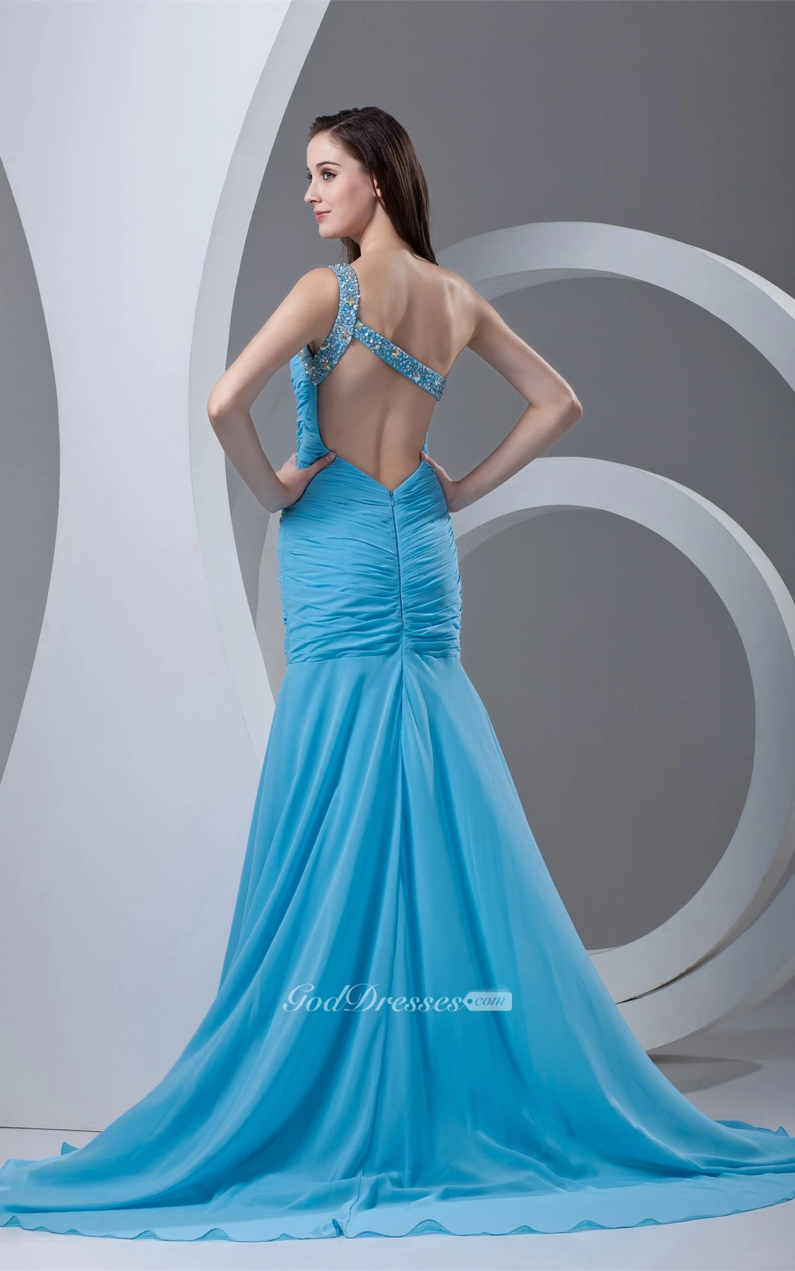 One-Shoulder Beaded Column Dress With Ruched Bodice