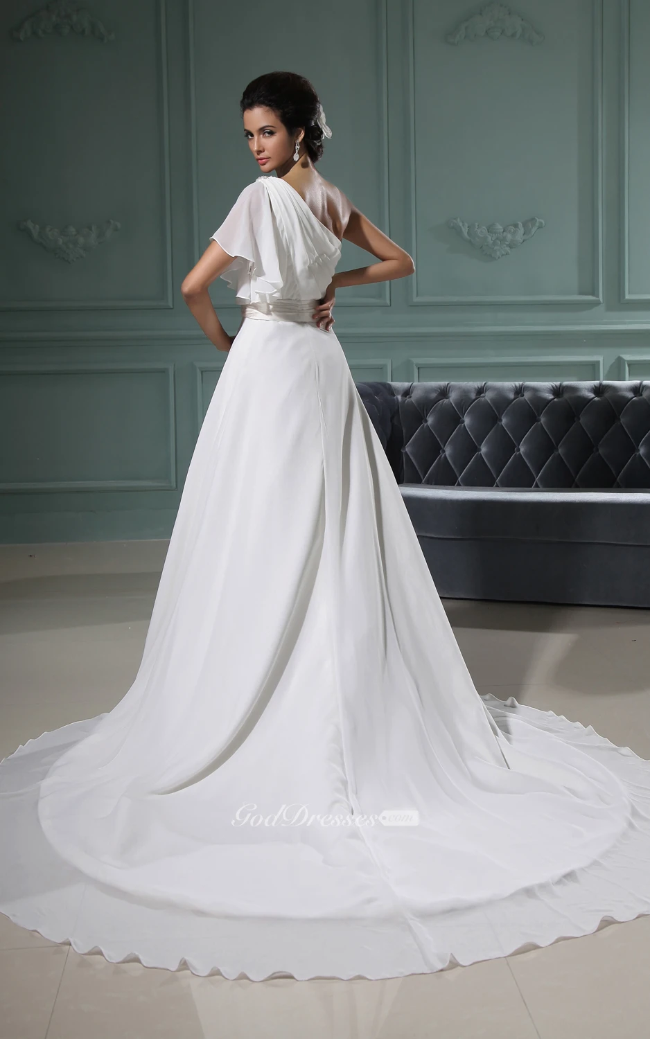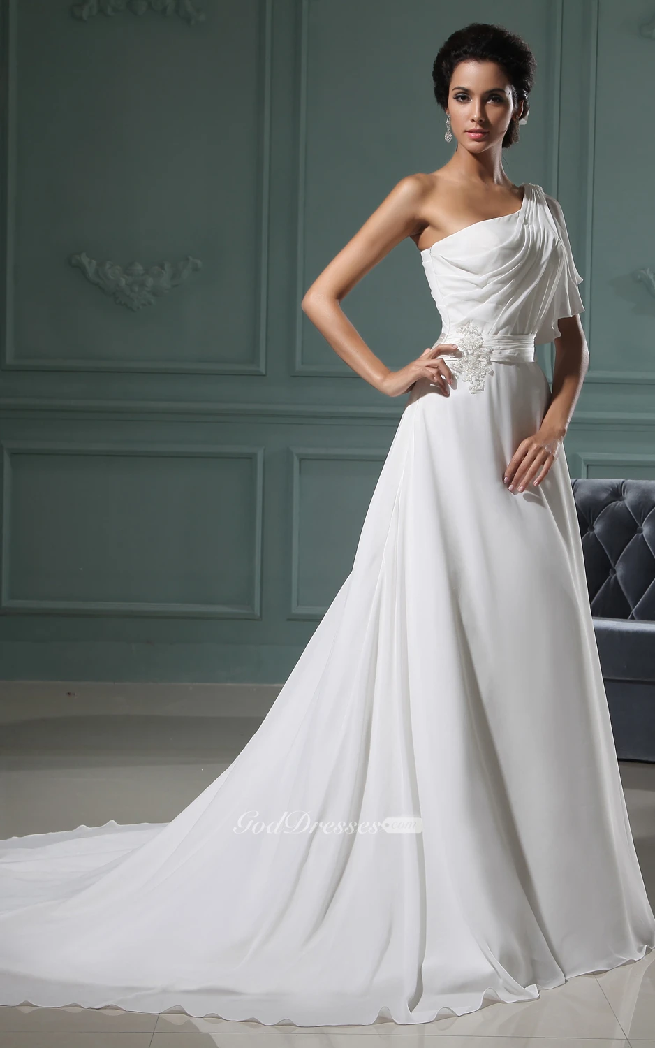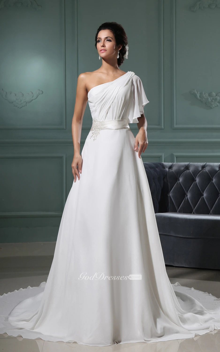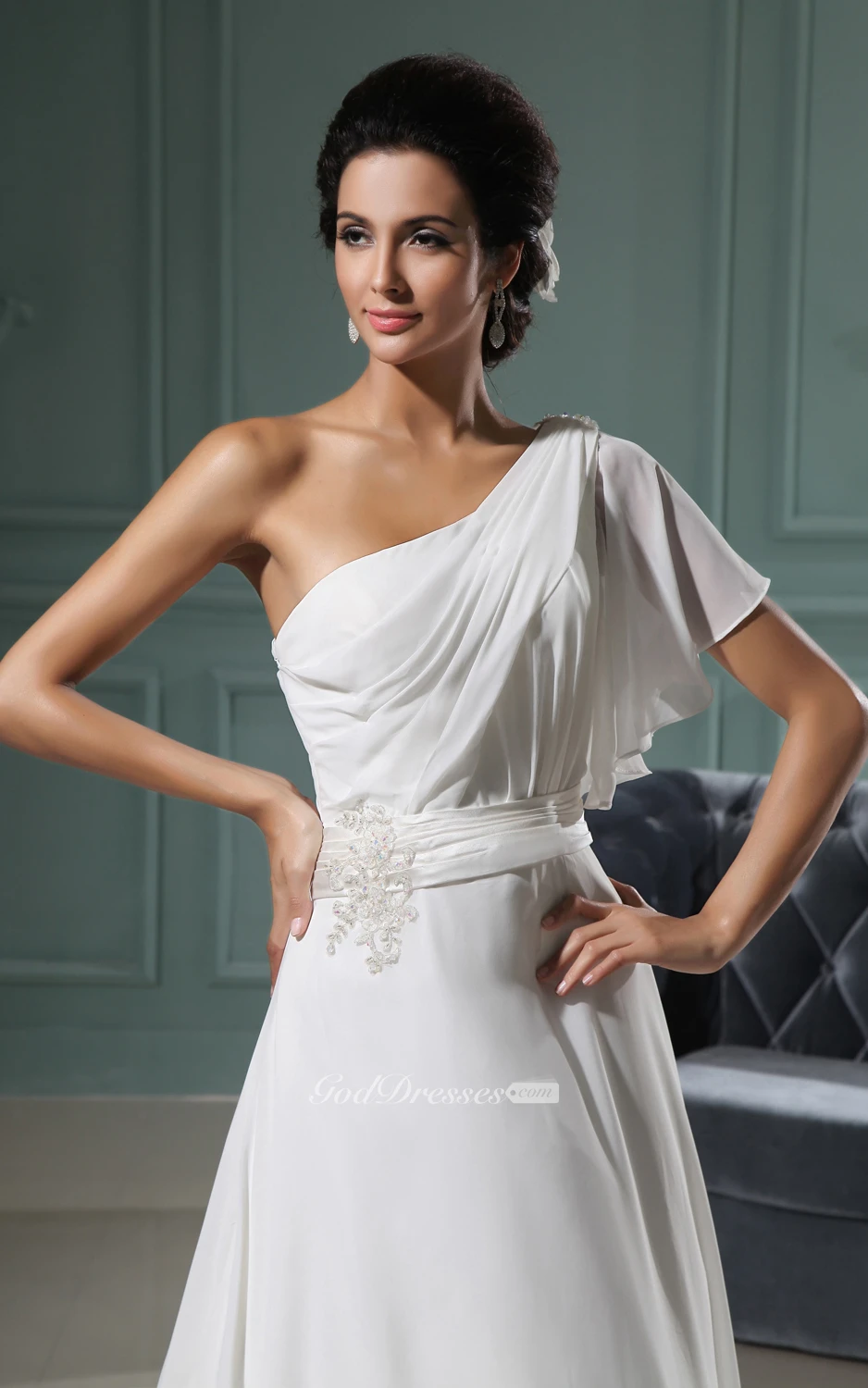 One-Shoulder Chiffon A-Line Dress With Ruching and Sating Sash