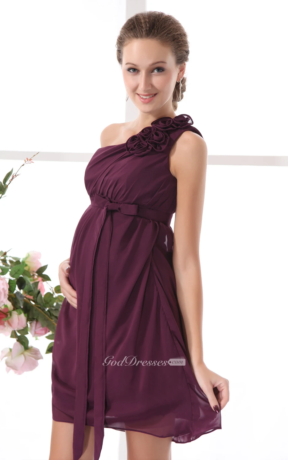 One-Shoulder Chiffon Short Dress With Flower and Ribbon