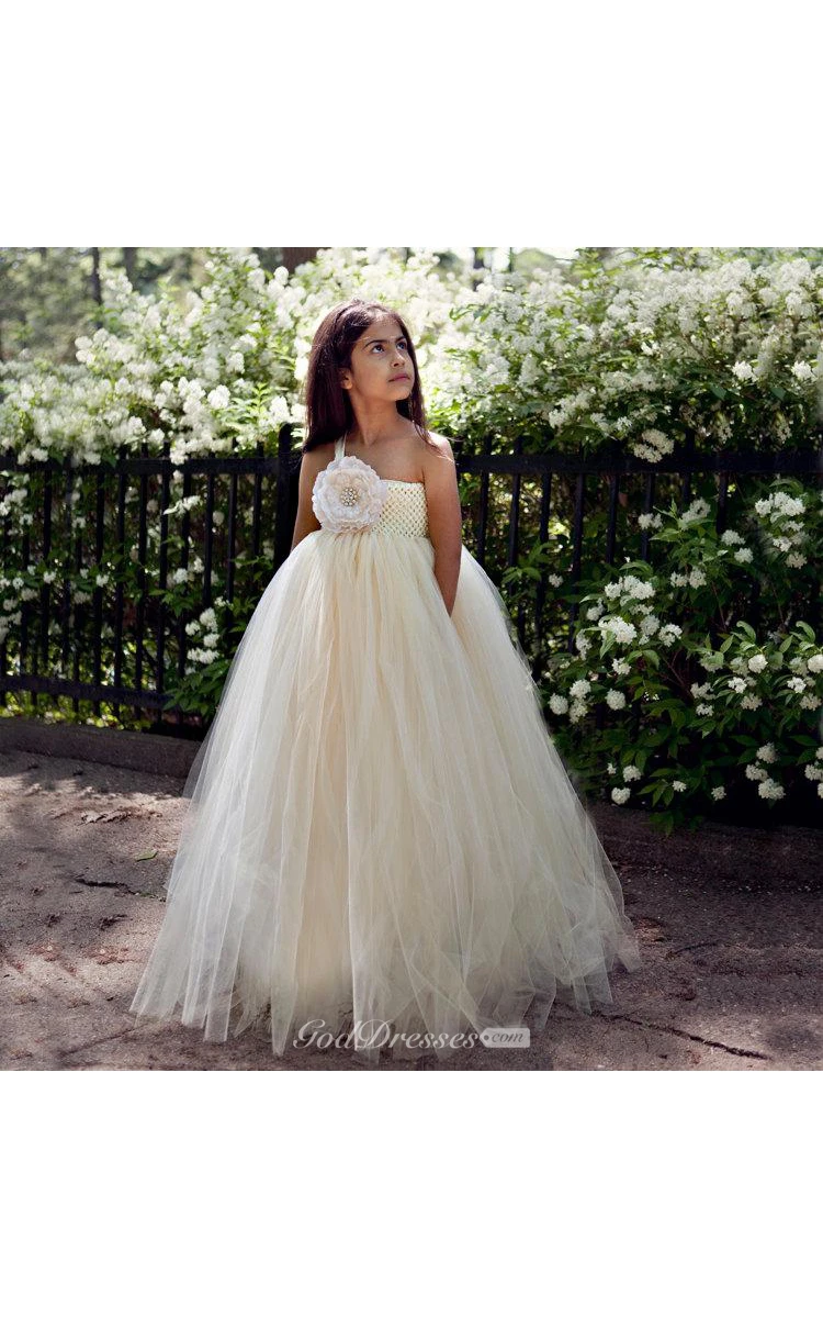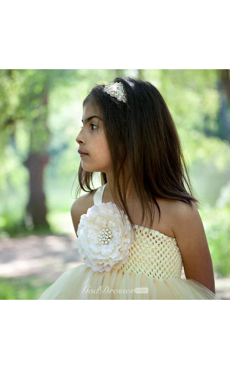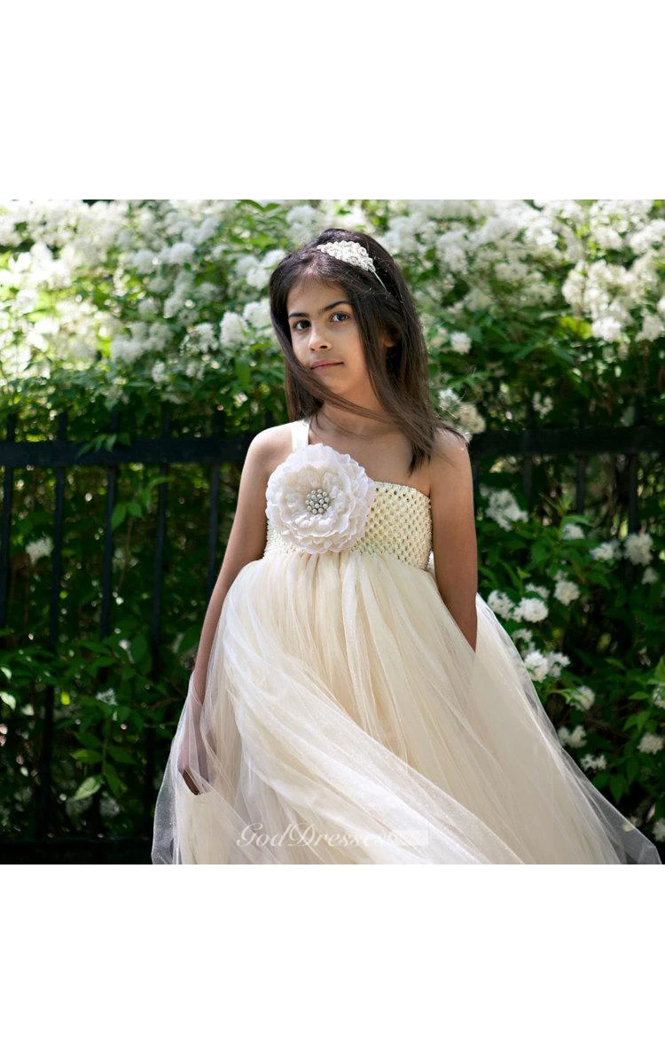 One-shoulder Empire Pleated Tulle Ball Gown With Flower