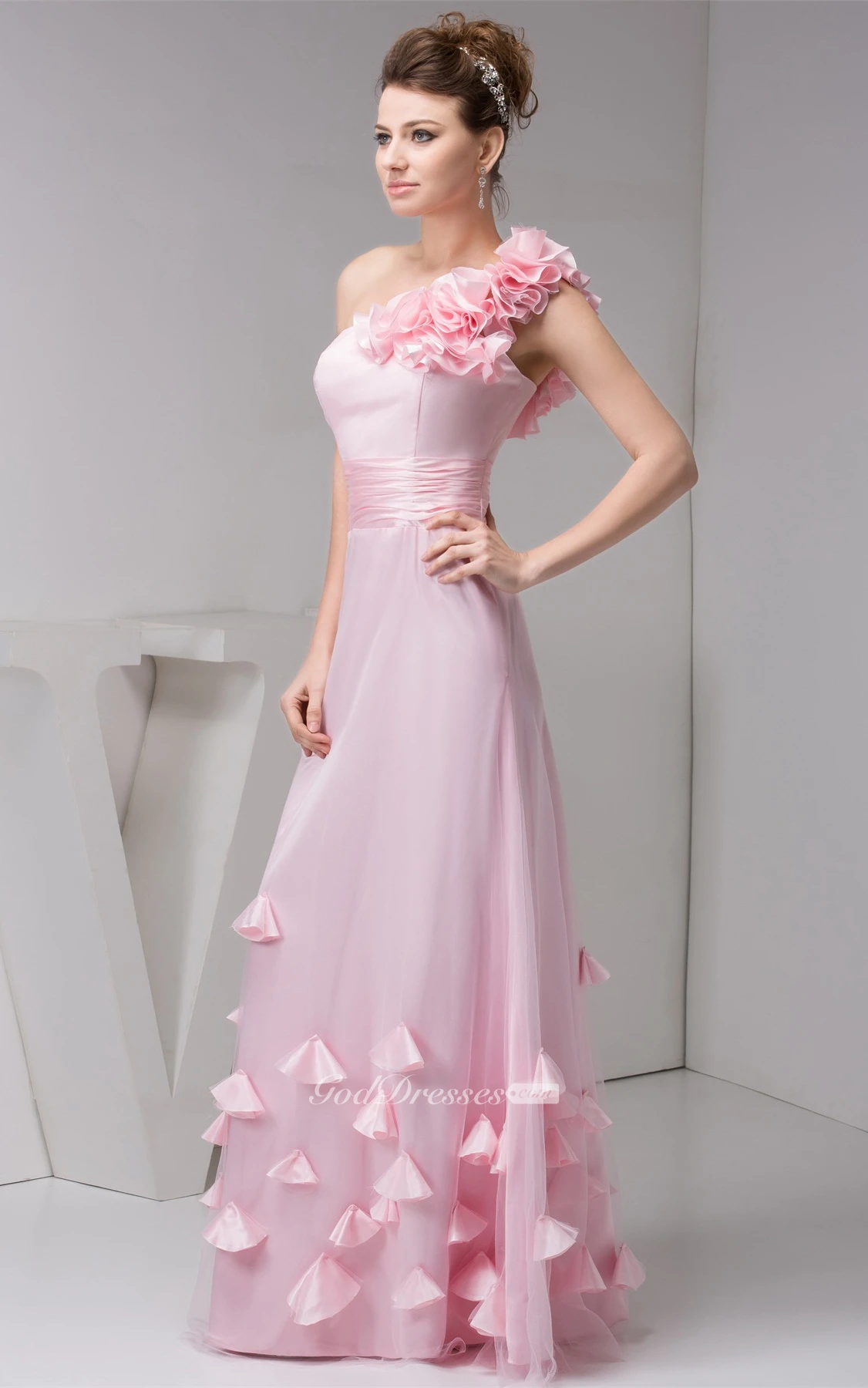 One-Shoulder Floor-Length A-Line Flower and Dress With Ruching