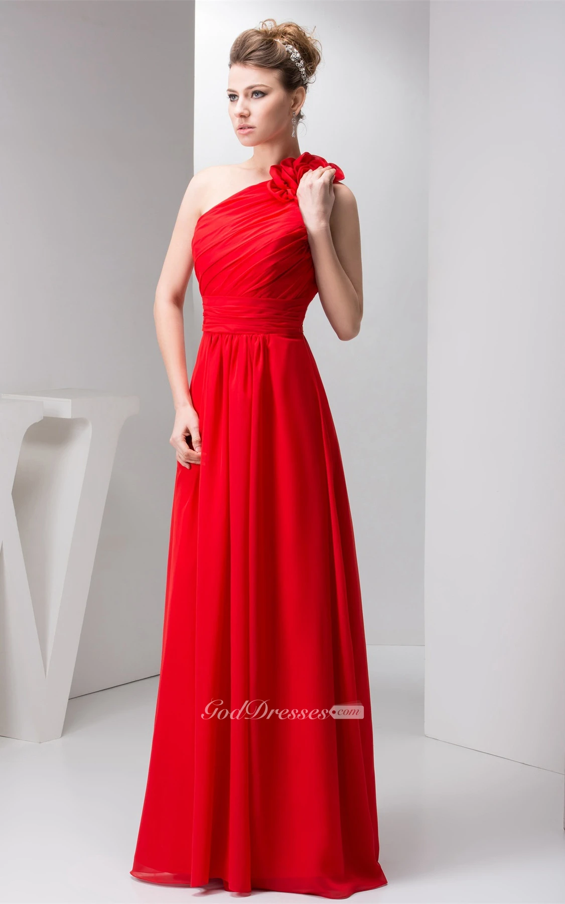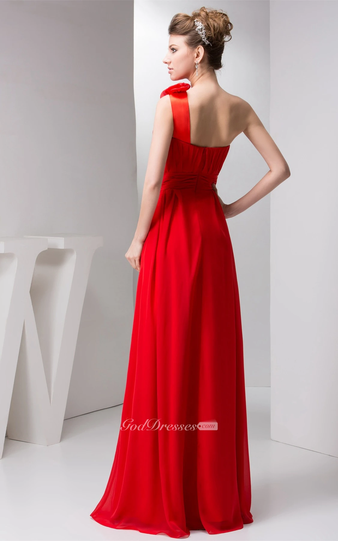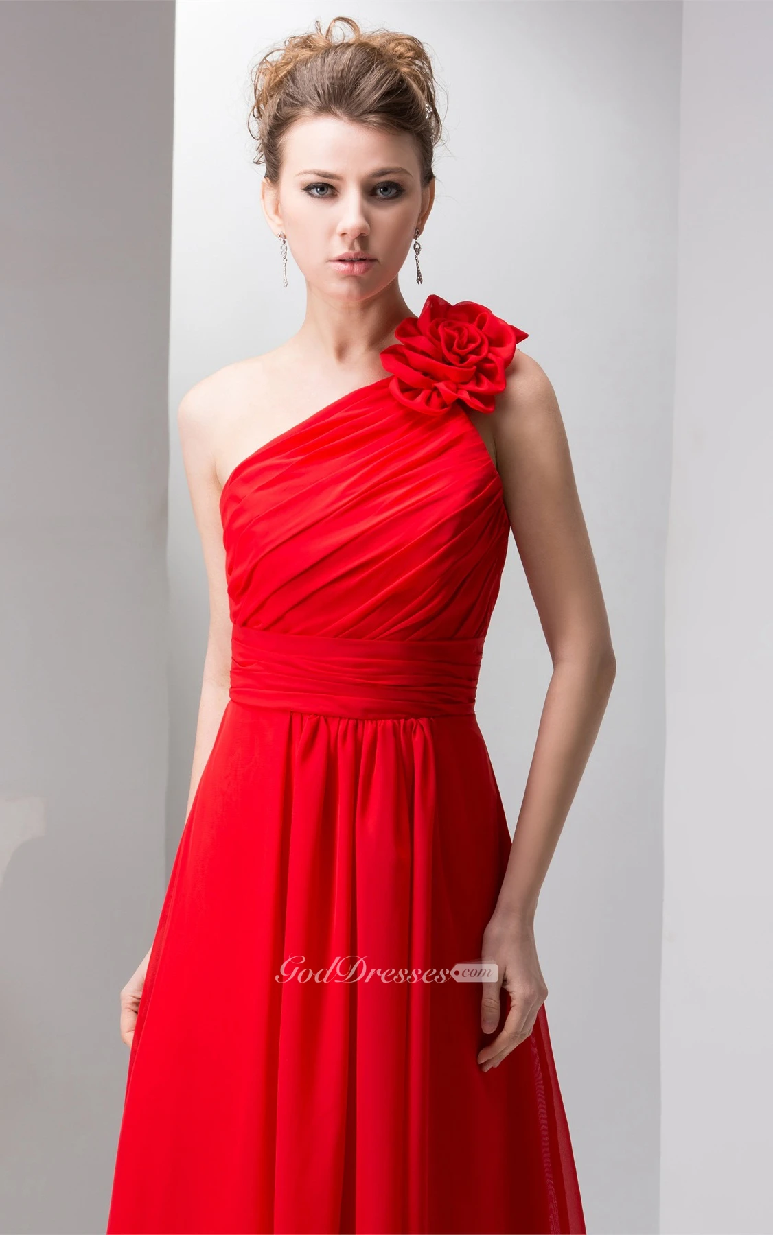 One-Shoulder Floor-Length Chiffon Floral Epaulet and Dress With Ruching