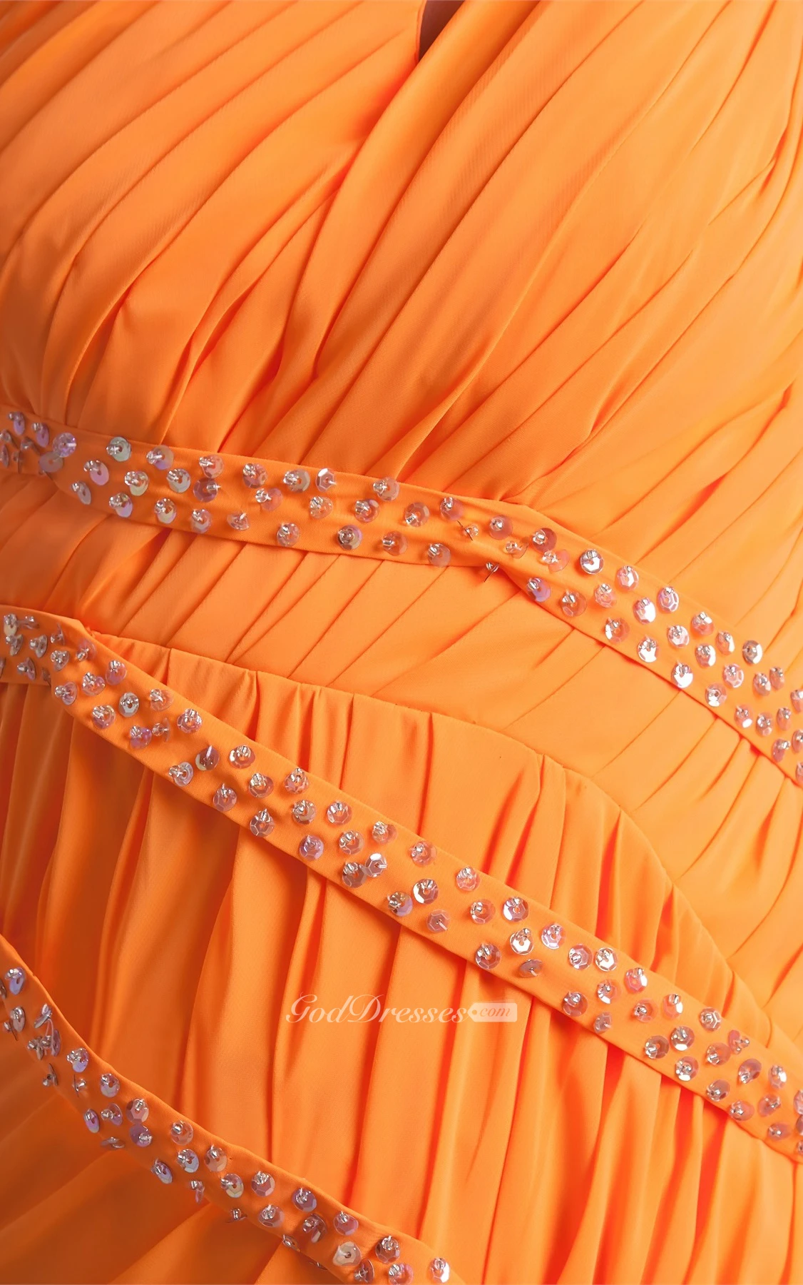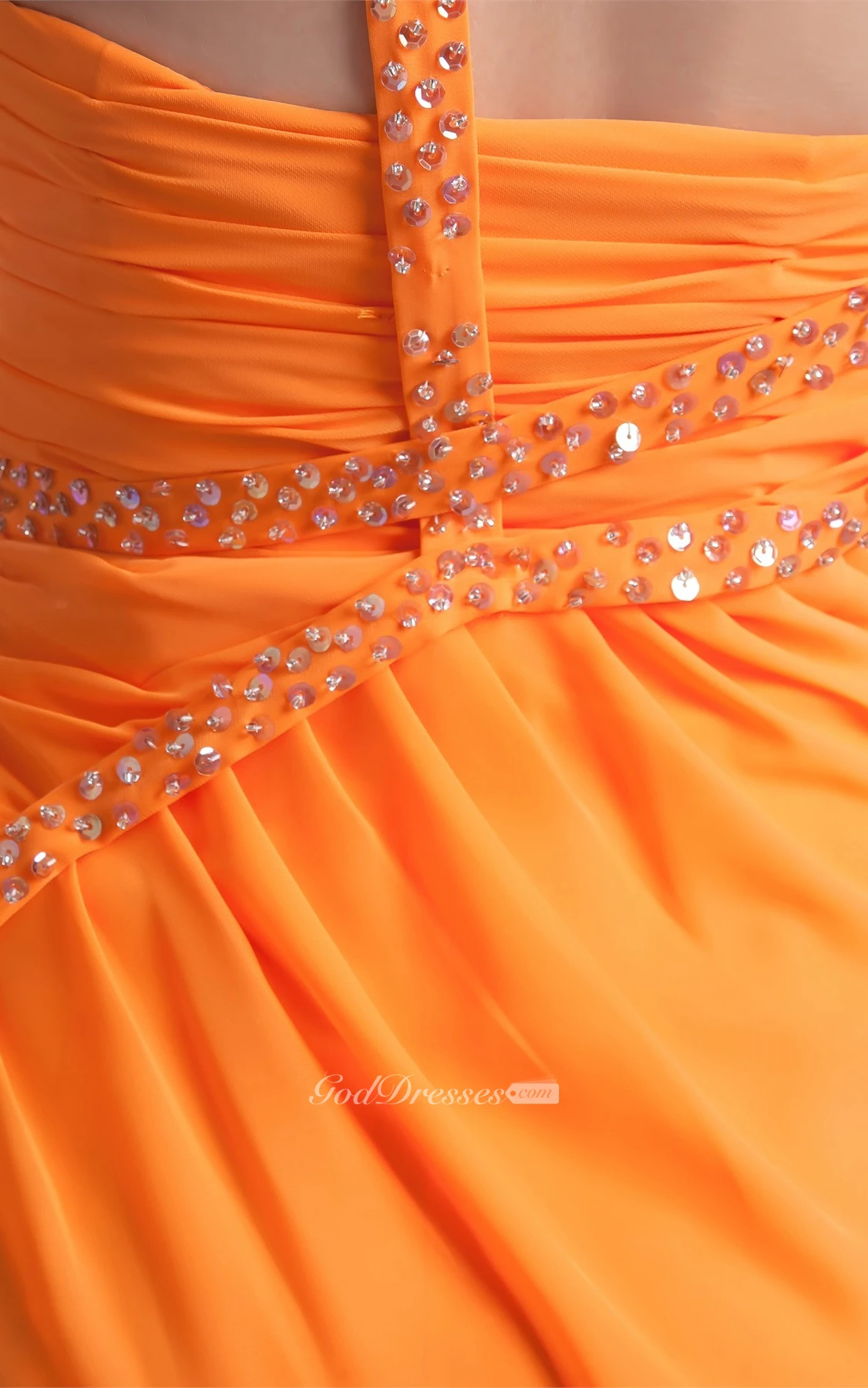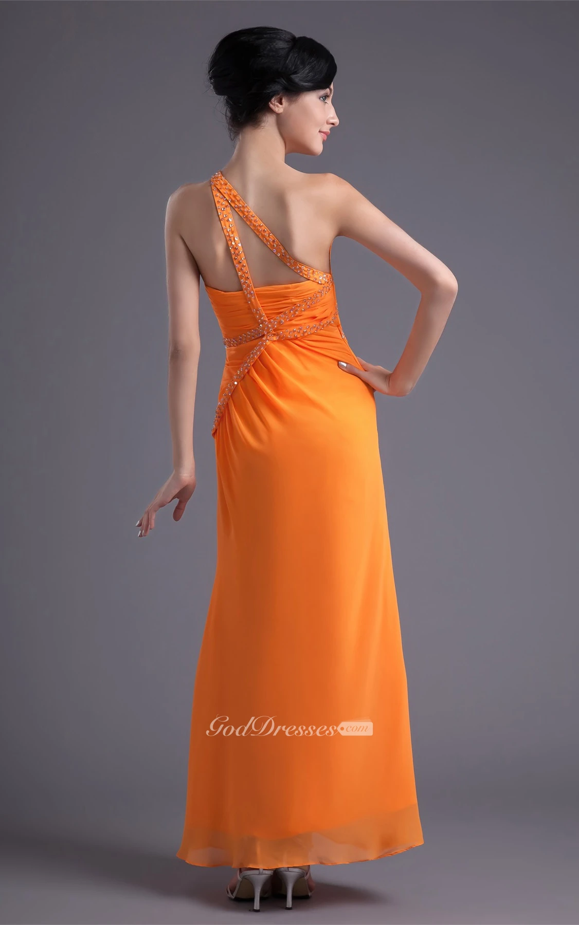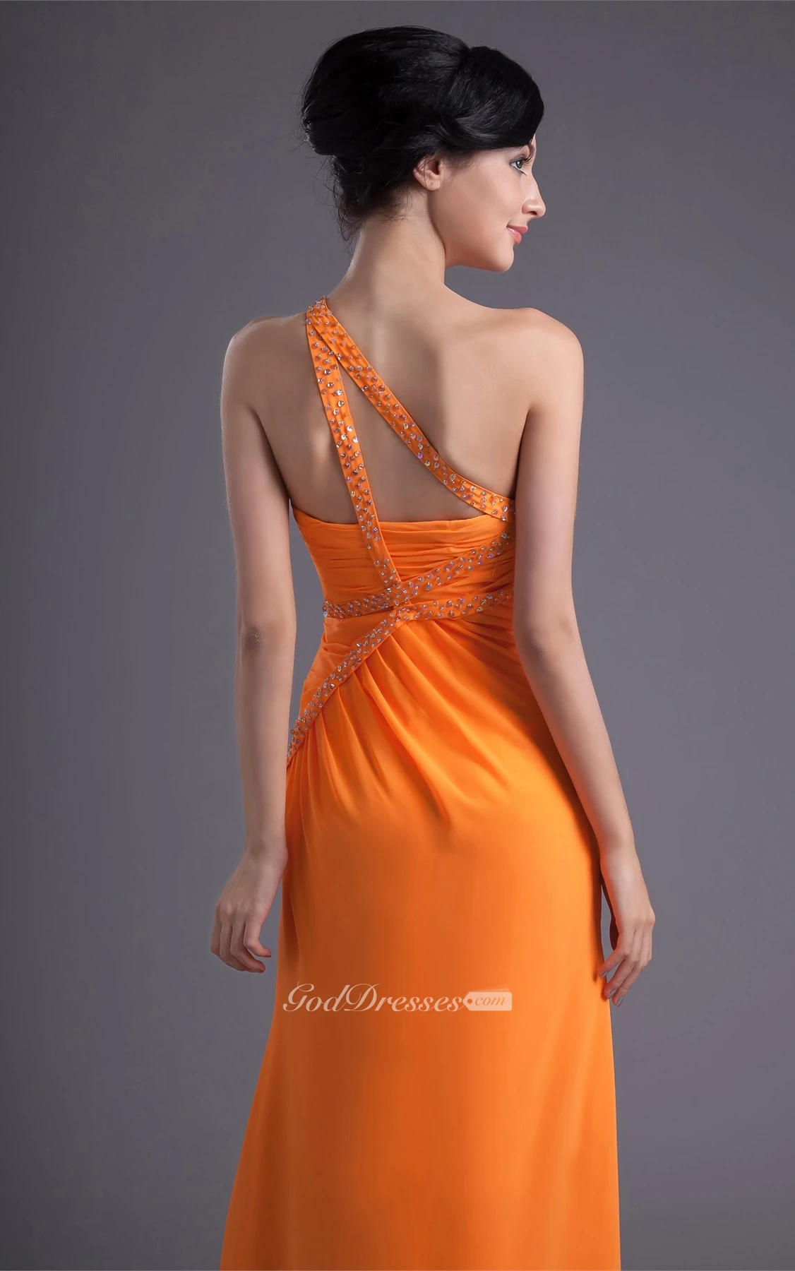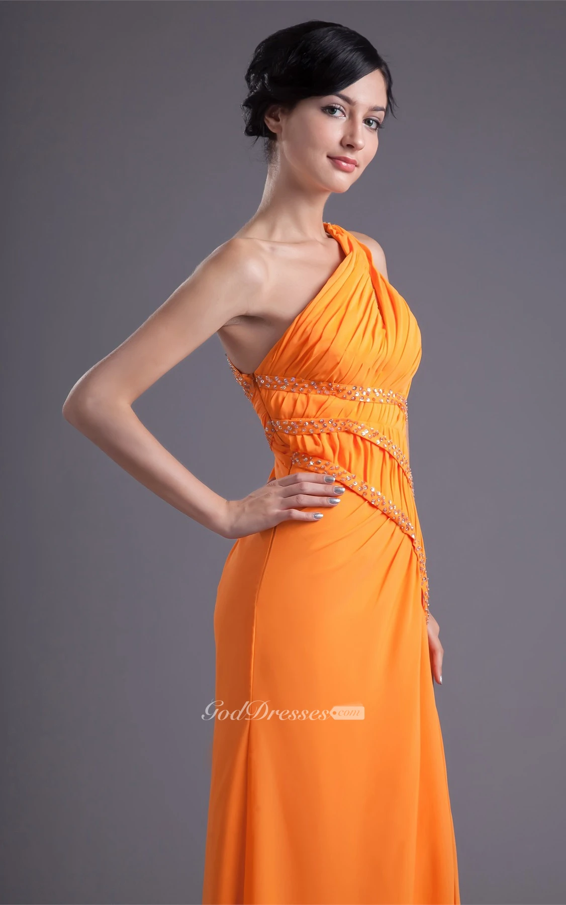 One-Shoulder Front-Split Chiffon Dress With Jewels