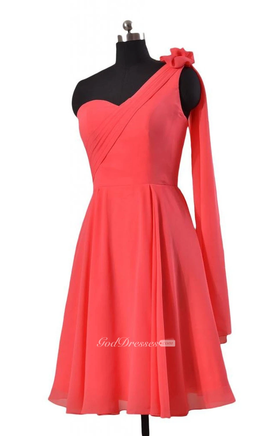 One-shoulder Knee-length Pleated Chiffon Dress With Drapped Sleeve