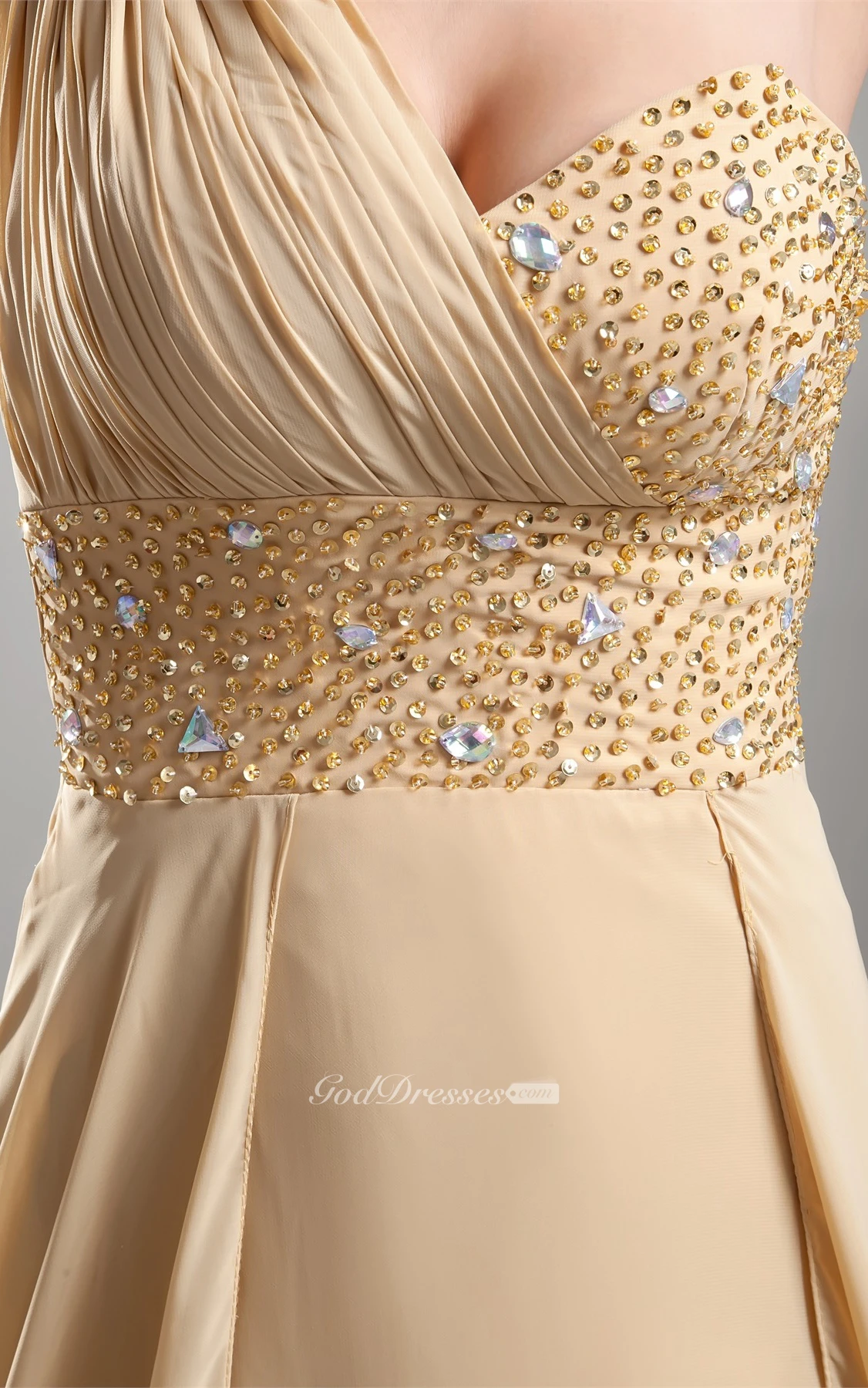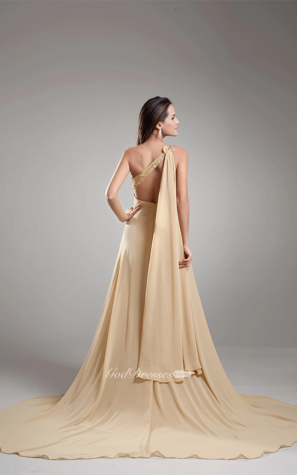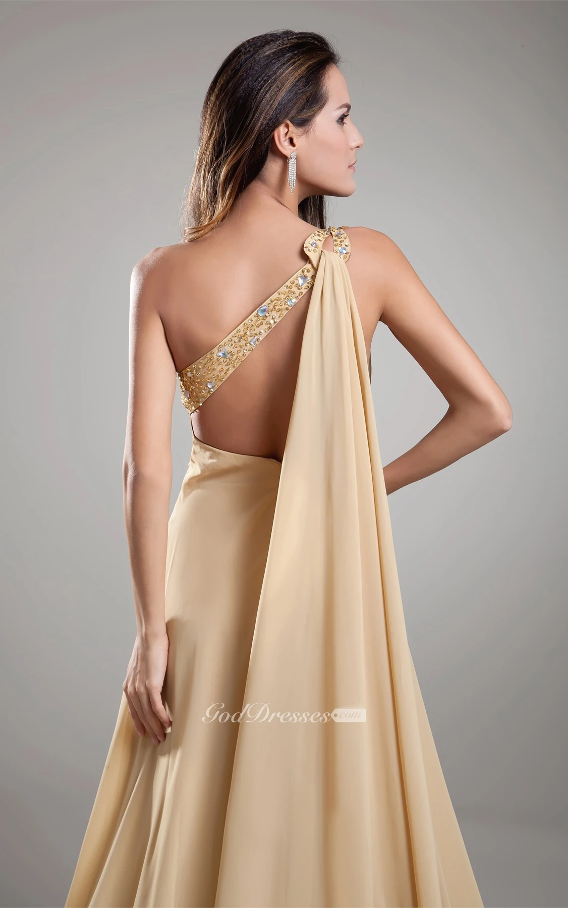 One-Shoulder Long Front-Split Dress With Jeweled Top