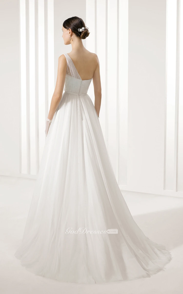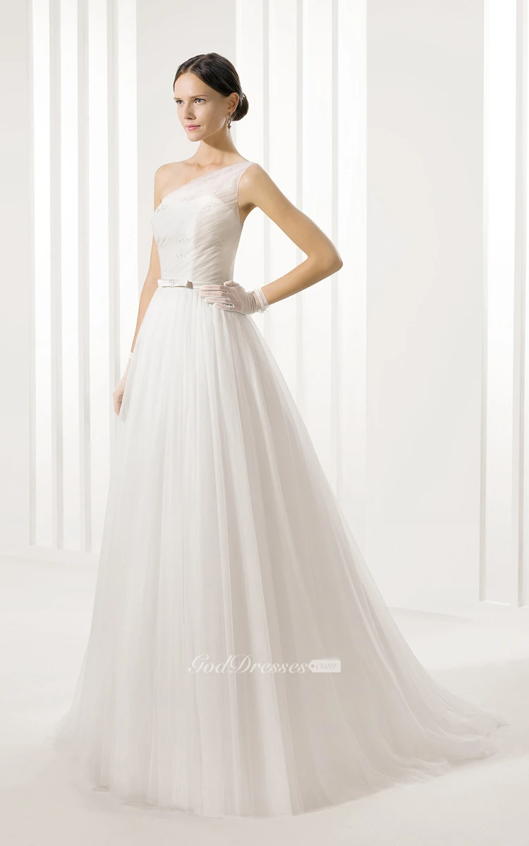 One-Shoulder Tulle Pleated Dress With Slim Belt
