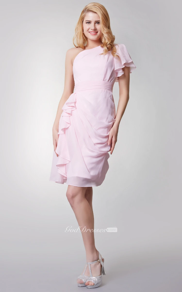 One Sleeve Draped Knee Length Chiffon Dress With Side Ruffles