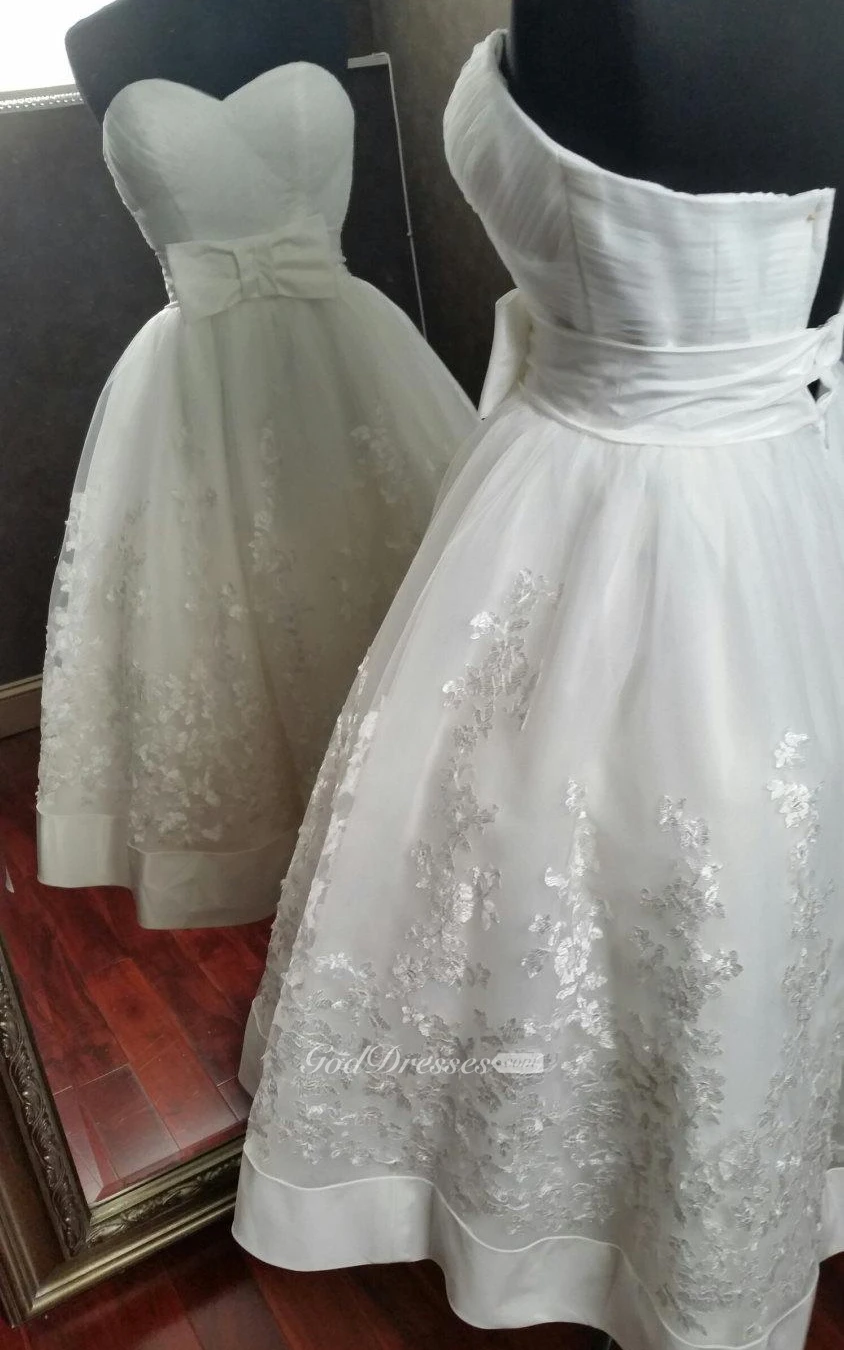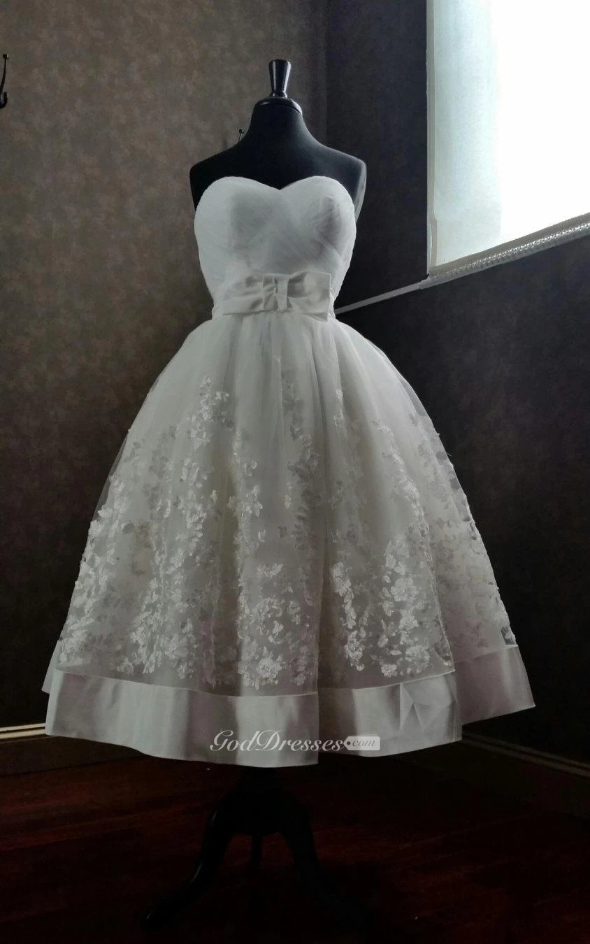 Organza and Lace Sweetheart A-Line Tea Length Dress With Bow