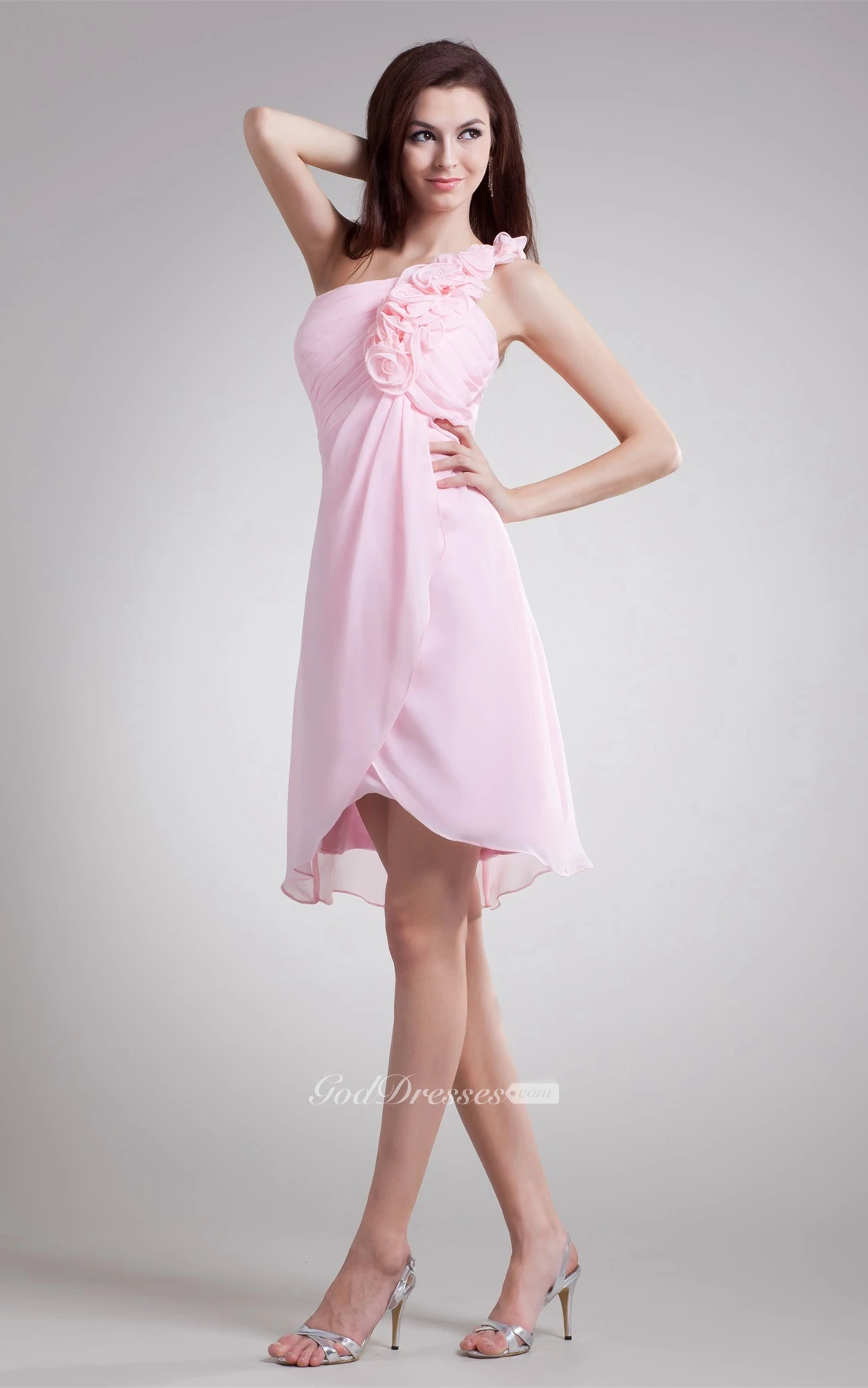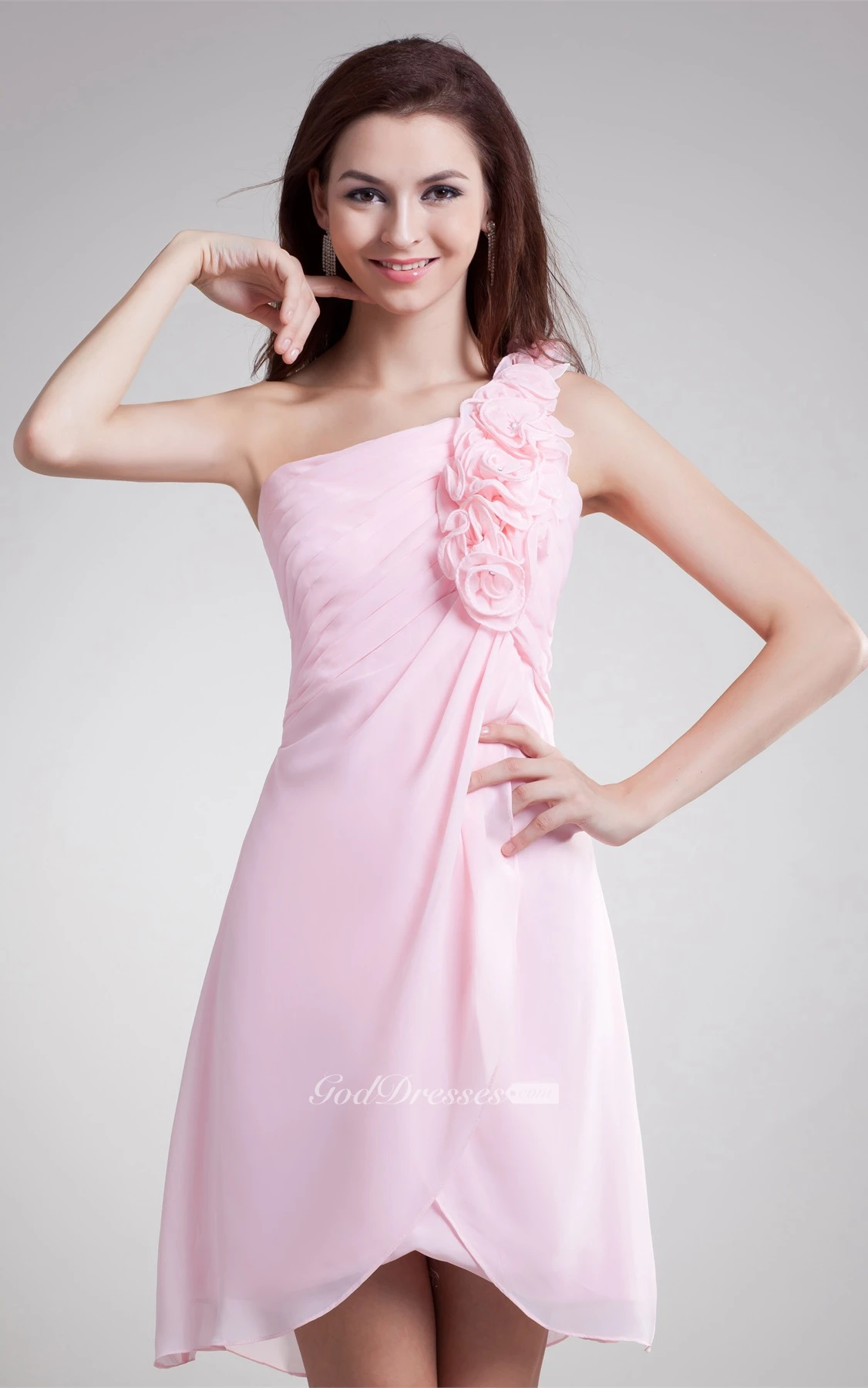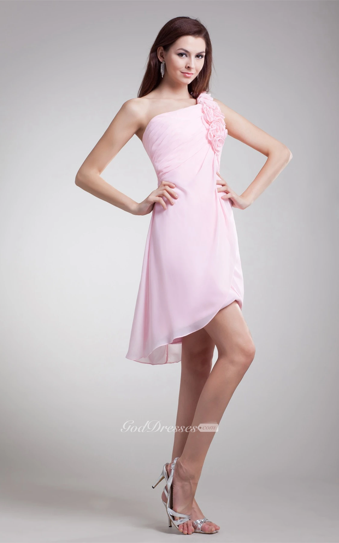 Pastel High-Low One-Shoulder Flower and Dress With Ruching