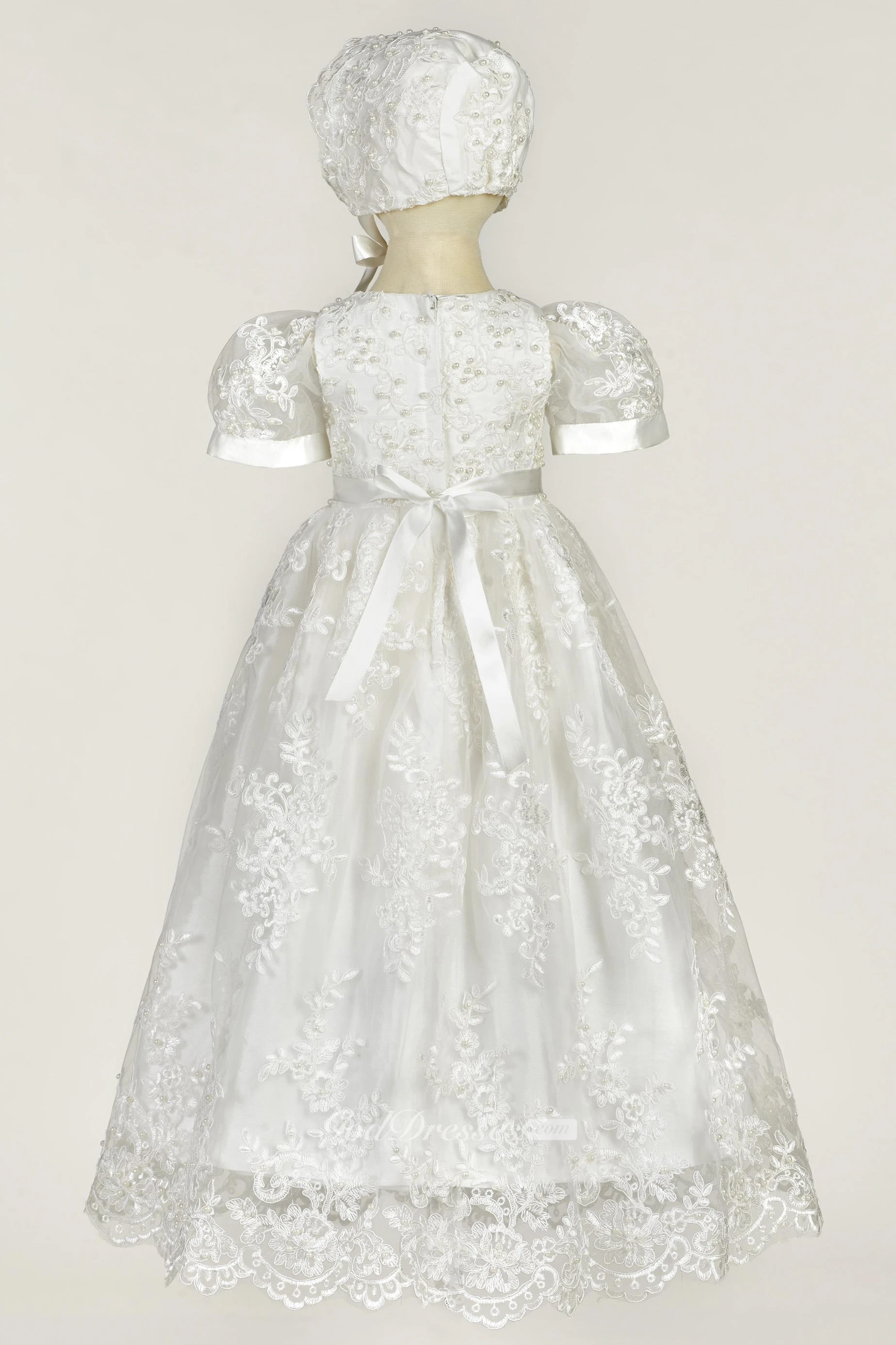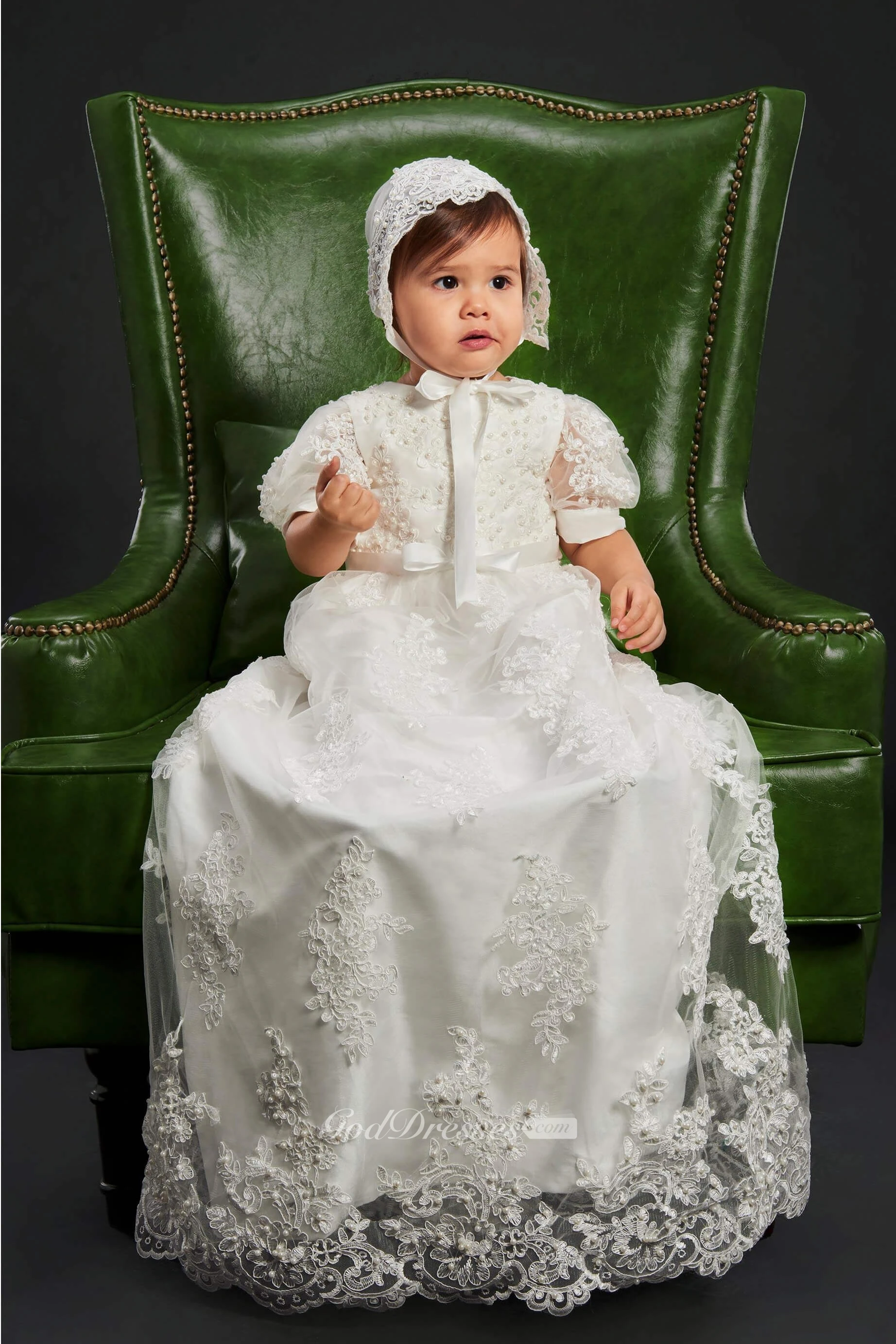 Pearls Appliqued Puff Sleeve Christening Gown With Lace