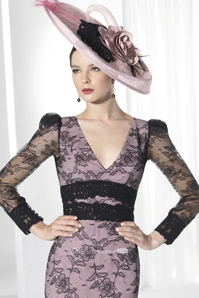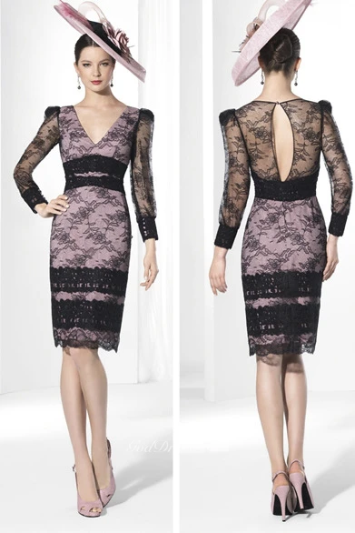 Pencil Appliqued Knee-Length V-Neck Illusion-Sleeve Lace Prom Dress