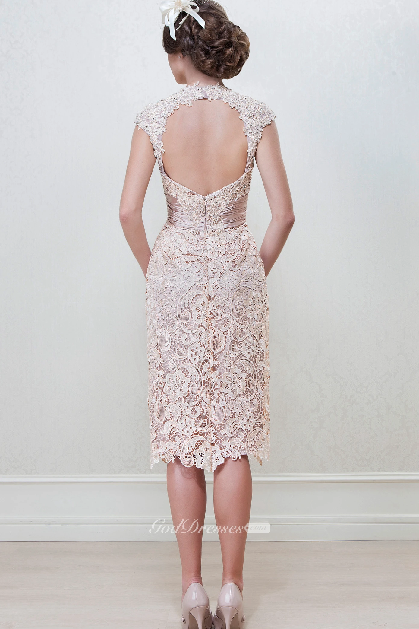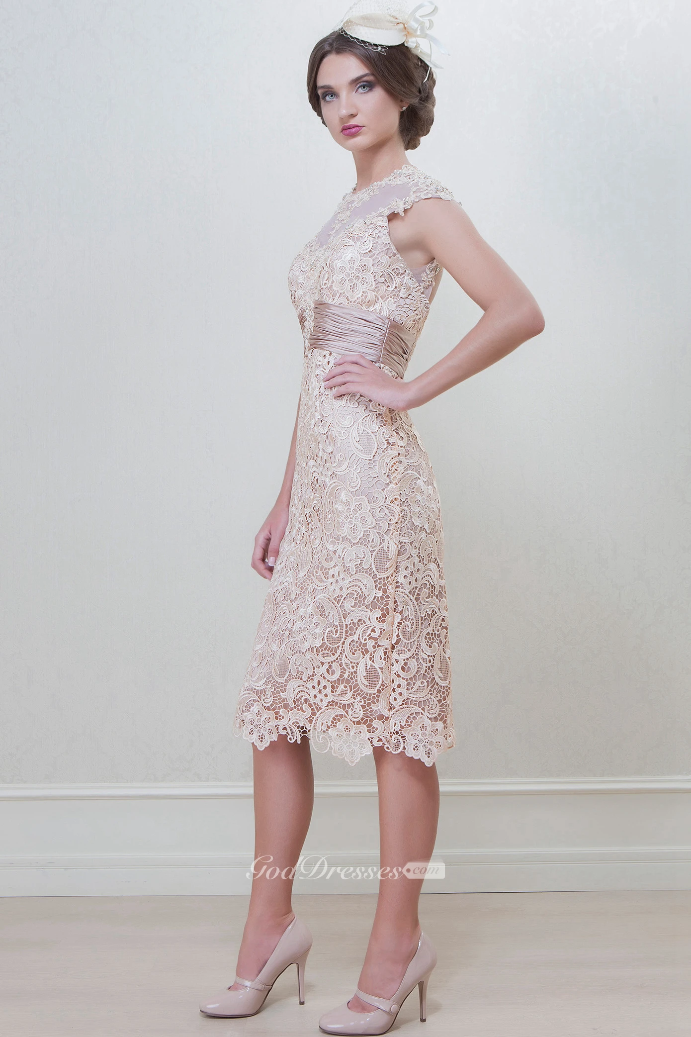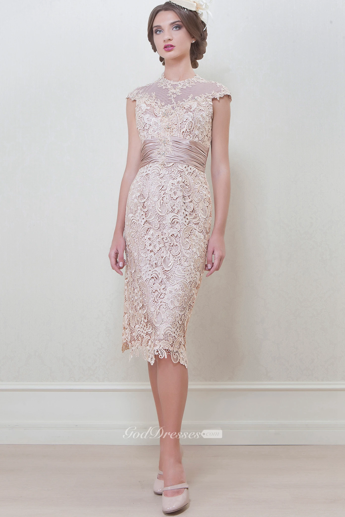 Pencil Knee-Length High Neck Appliqued Cap Sleeve Lace Mother Of The Bride Dress
