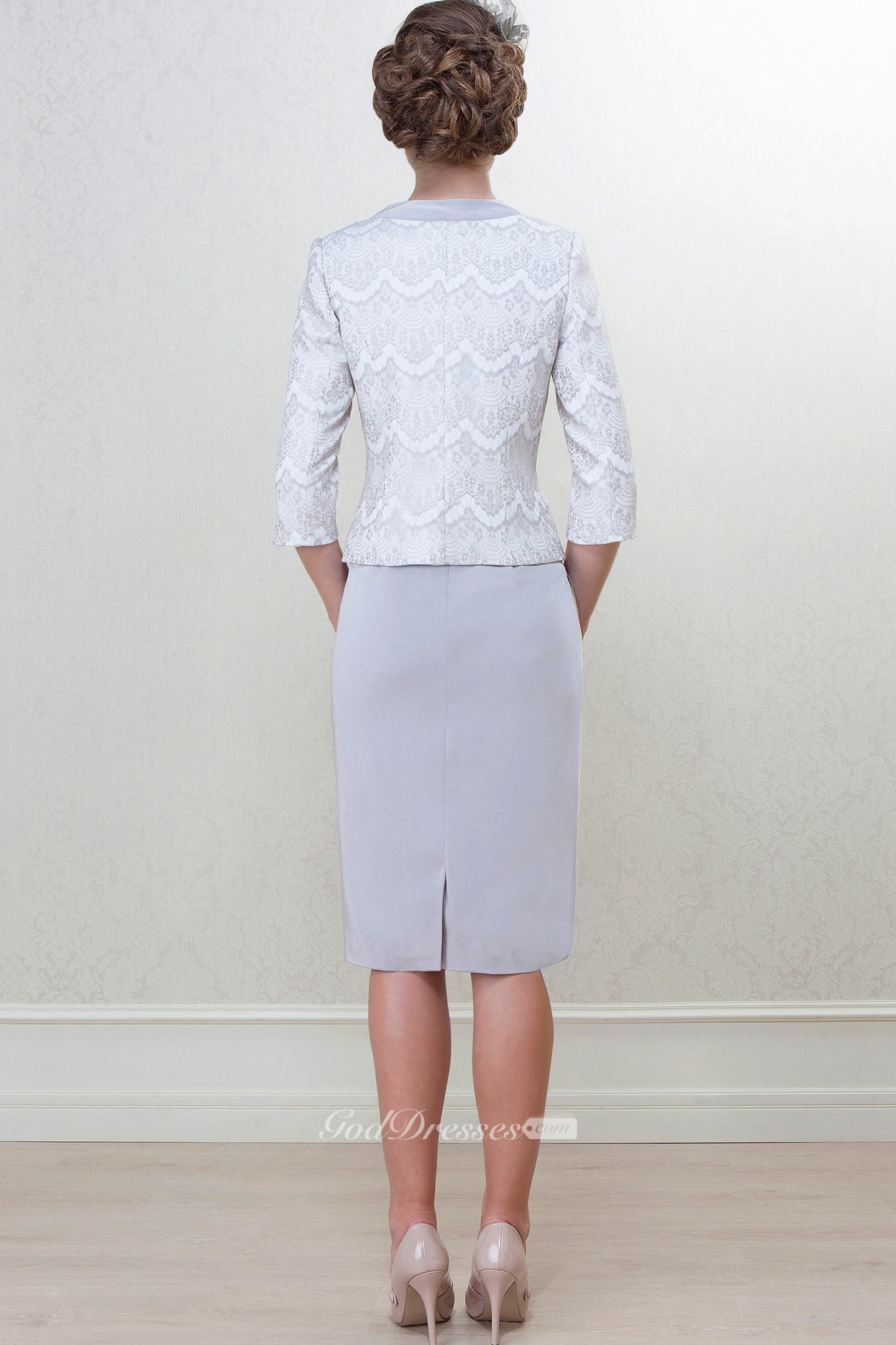 Pencil Knee-Length High Neck Caped 3-4 Sleeve Satin Mother Of The Bride Dress