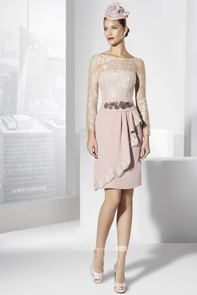 Pencil Long Sleeve Scoop Neck Short Mini Appliqued Jersey Prom Dress With Draping