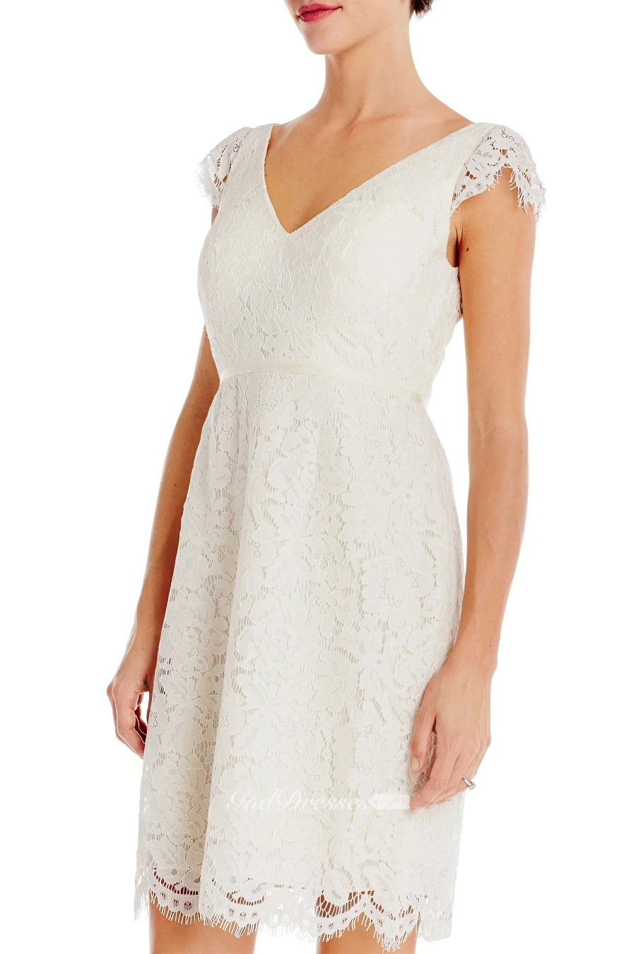 Pencil Mini Cap-Sleeve V-Neck Lace Little White Dress With Low-V Back