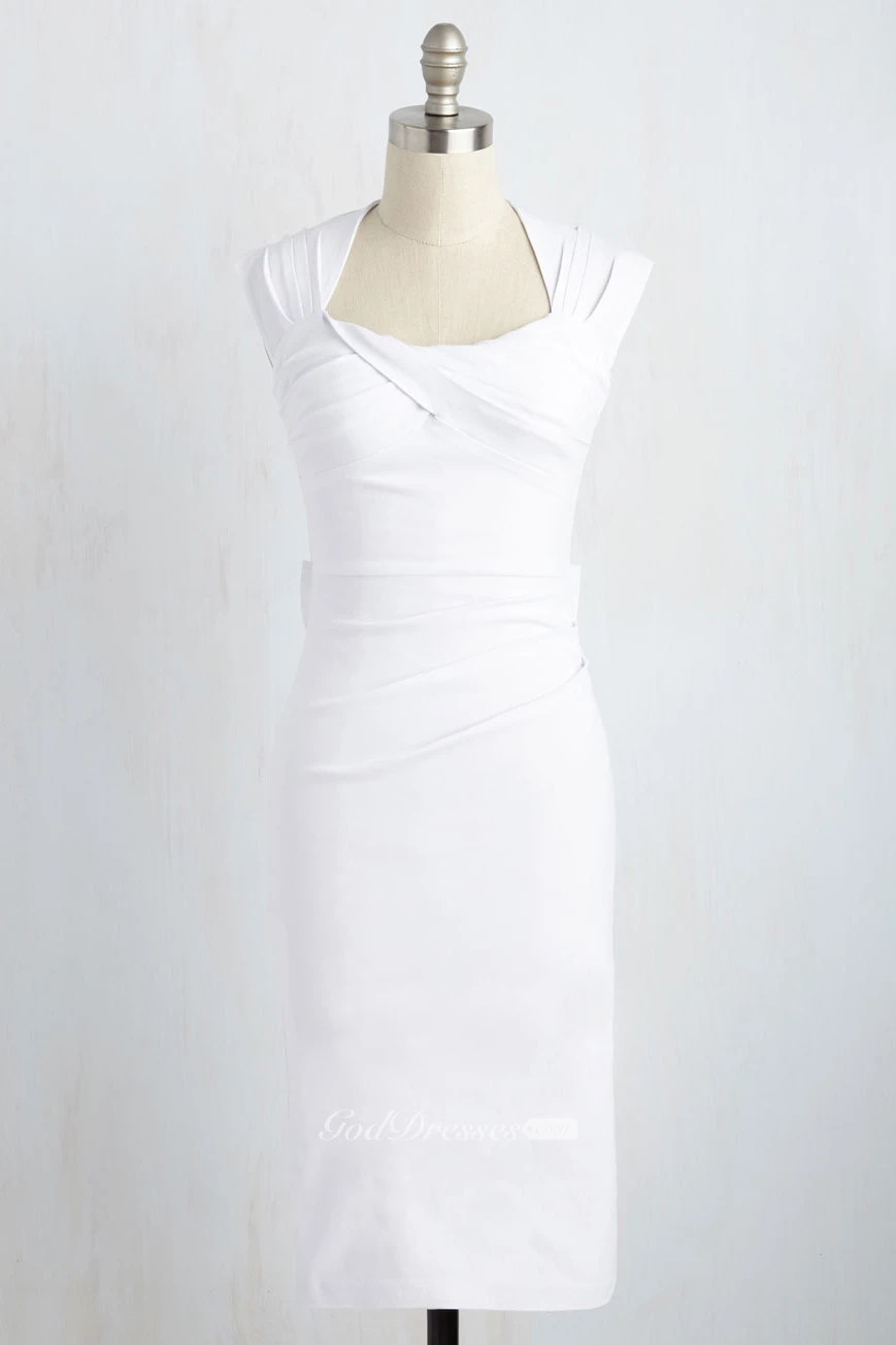 Pencil Sleeveless Knee-Length V-Neck Chiffon Wedding Dress With Ruching And Split Back