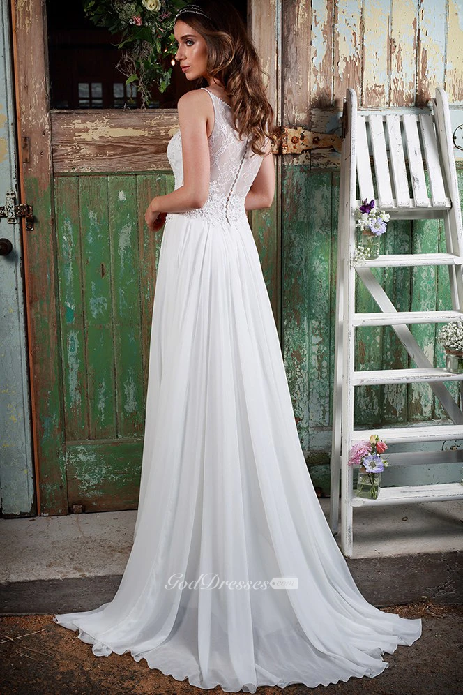Pleated Spaghetti Long Chiffon Wedding Dress With Appliques And Illusion