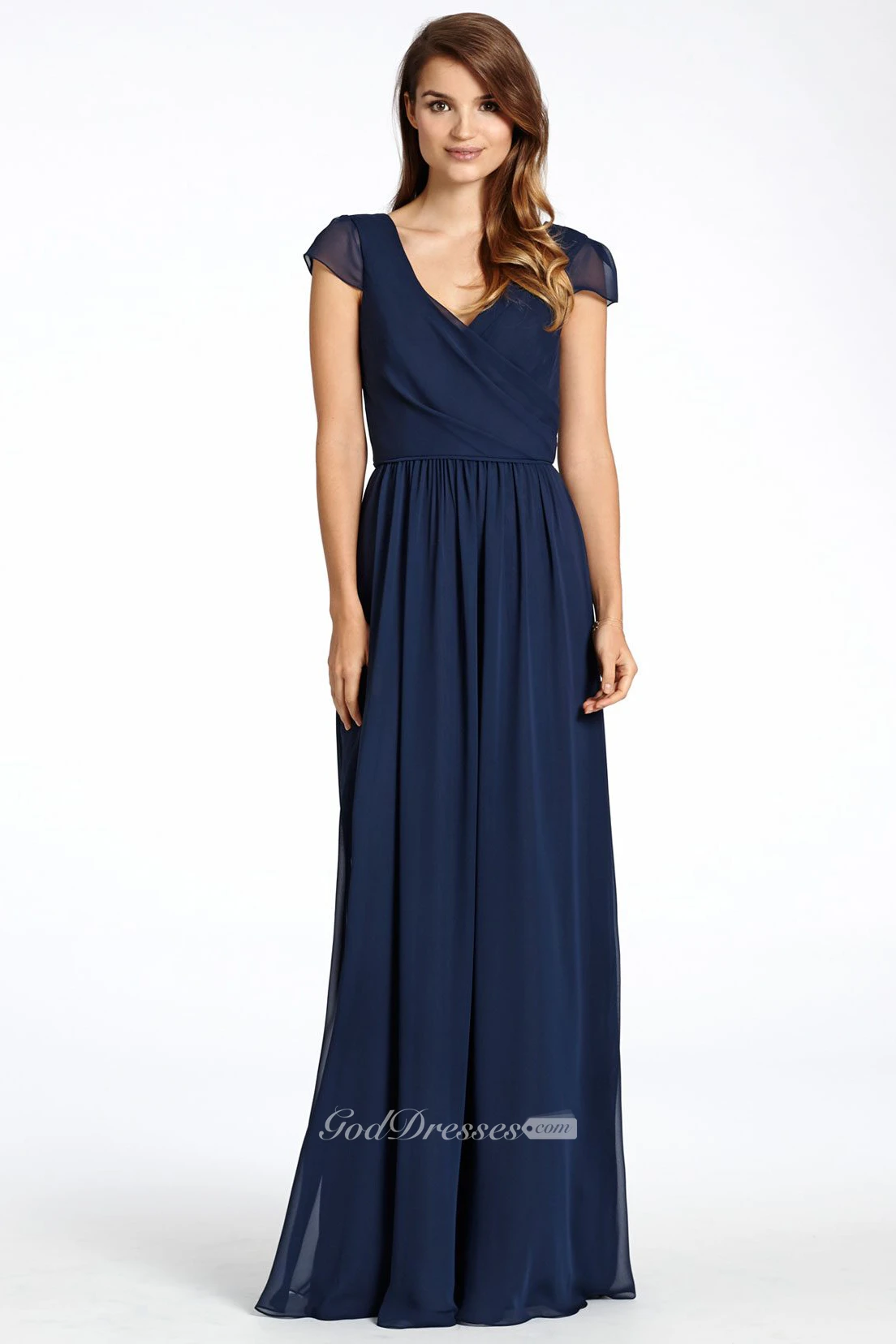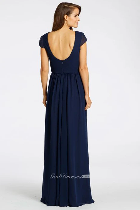 Pleated V-Neck Floor-Length Cap-Sleeve Chiffon Bridesmaid Dress With Low-V Back